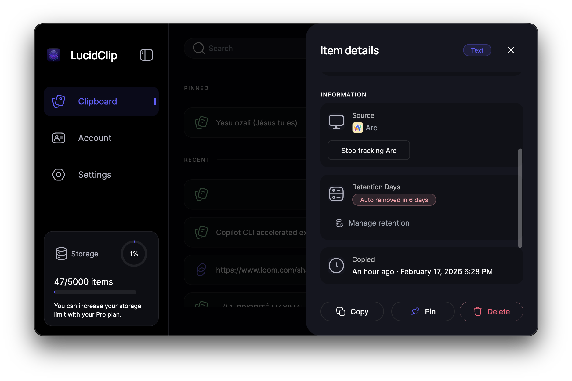 LucidClip is a native, privacy-first clipboard manager for macOS and desktop platforms. It stores everything locally, gives you full control over retention and exclusions, and lets you instantly access your clipboard history. No cloud. No tracking. Your data stays on your device.