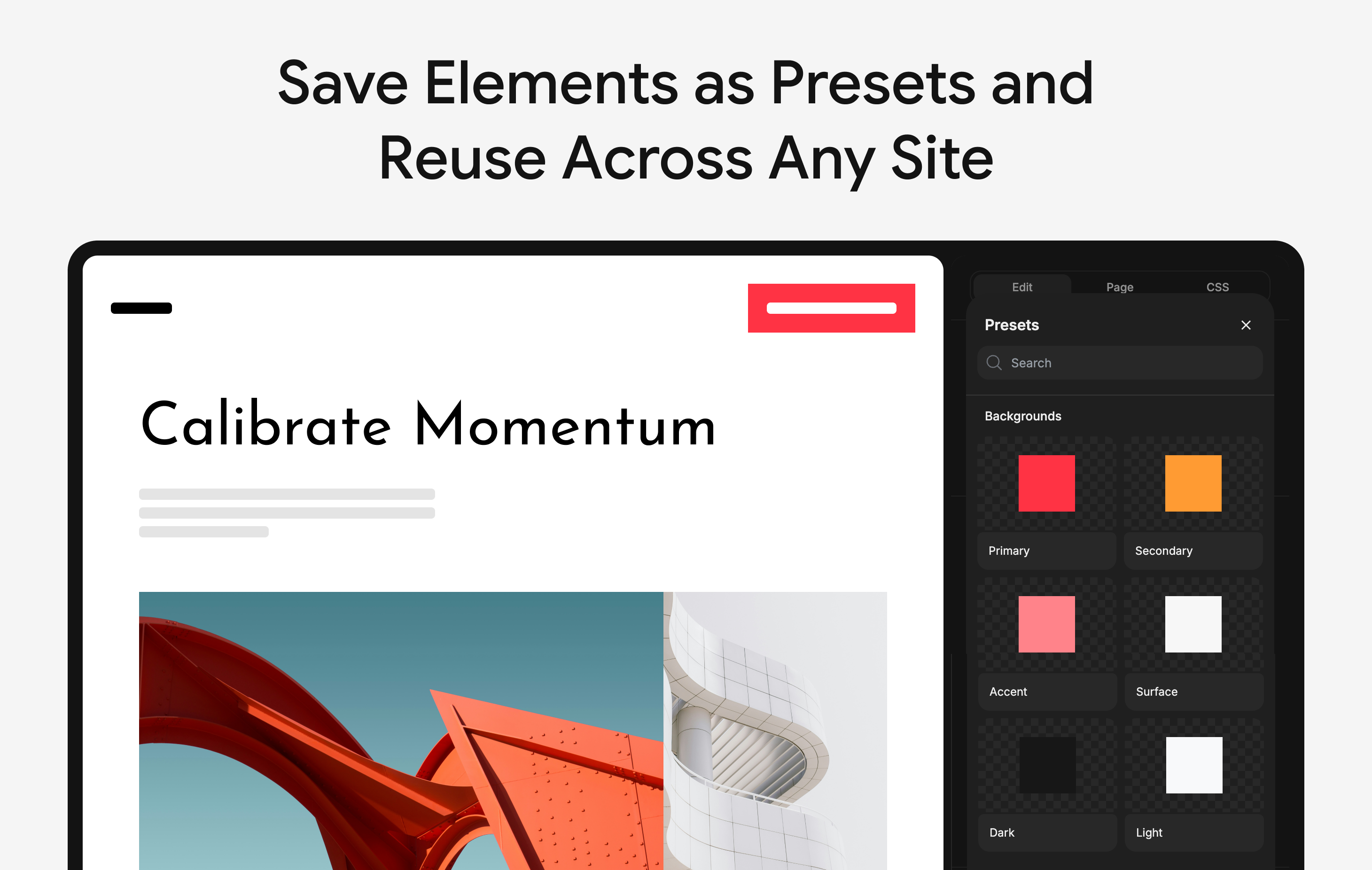 A visual CSS editor that lives in your browser. Select any element, tweak its styles in a side panel, and instantly see changes on the page. Export your changes as CSS, Tailwind, SCSS, or JSX. Built-in presets automatically inherit the site's own color palette, so your edits look native from the start.