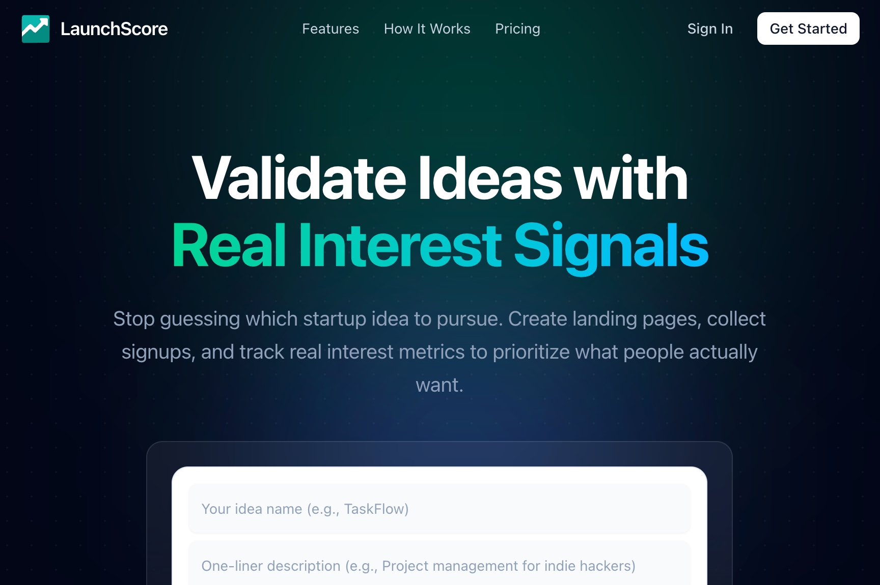 Validate startup ideas before you write a single line of codeStop building products nobody wants. LaunchScore lets you describe an idea, instantly generates a landing page, and measures real interest from real people. Signups, clicks, engagement. Get actual demand signals instead of guessing. Built for founders who are tired of spending months on ideas that go nowhere. Describe your concept, launch a test page, drive traffic, and let the data tell you whether to build or move on.
