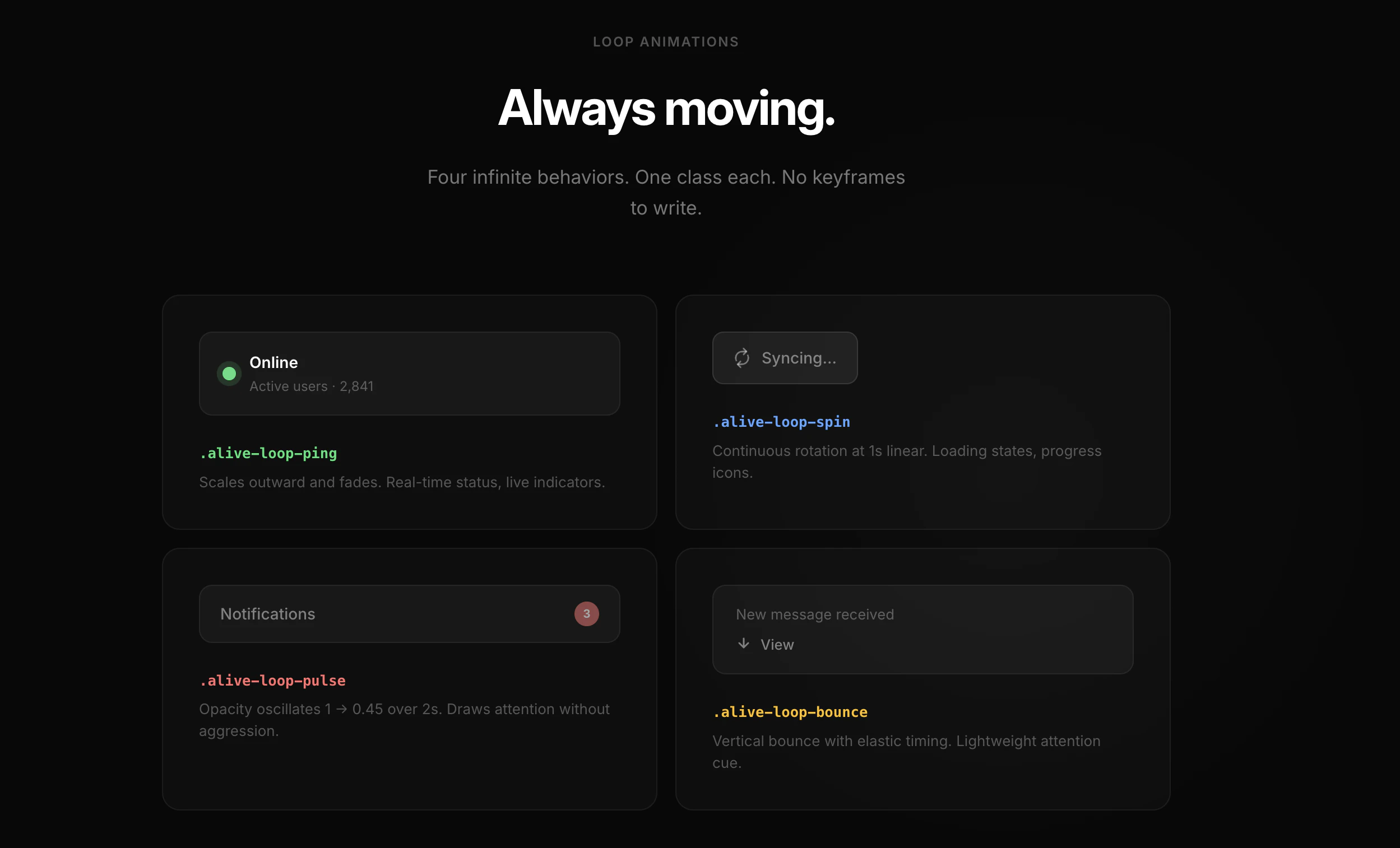 AliveUI is a motion-first CSS framework. Every surface has depth, every interaction is alive. Add physics-based motion to any web project with a single PostCSS plugin.