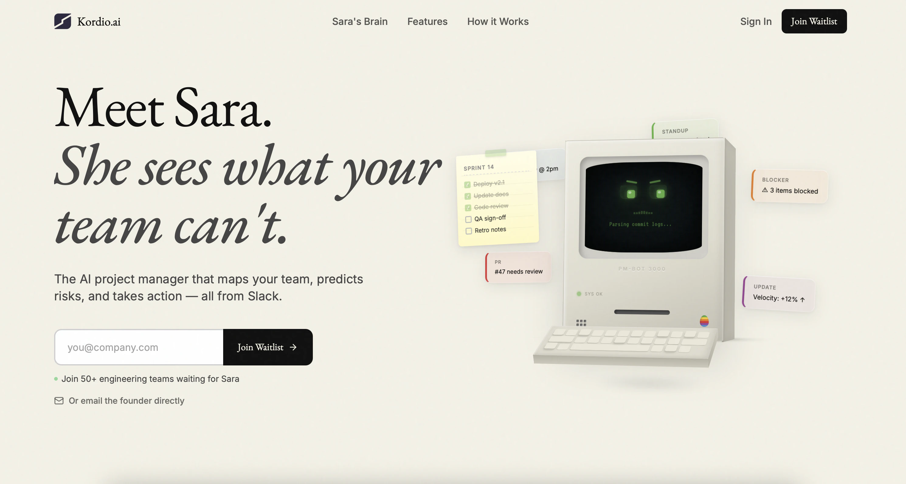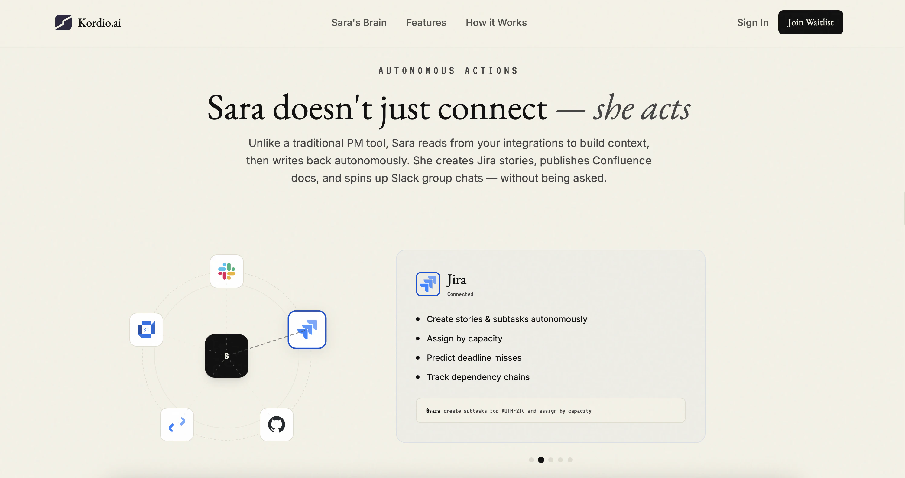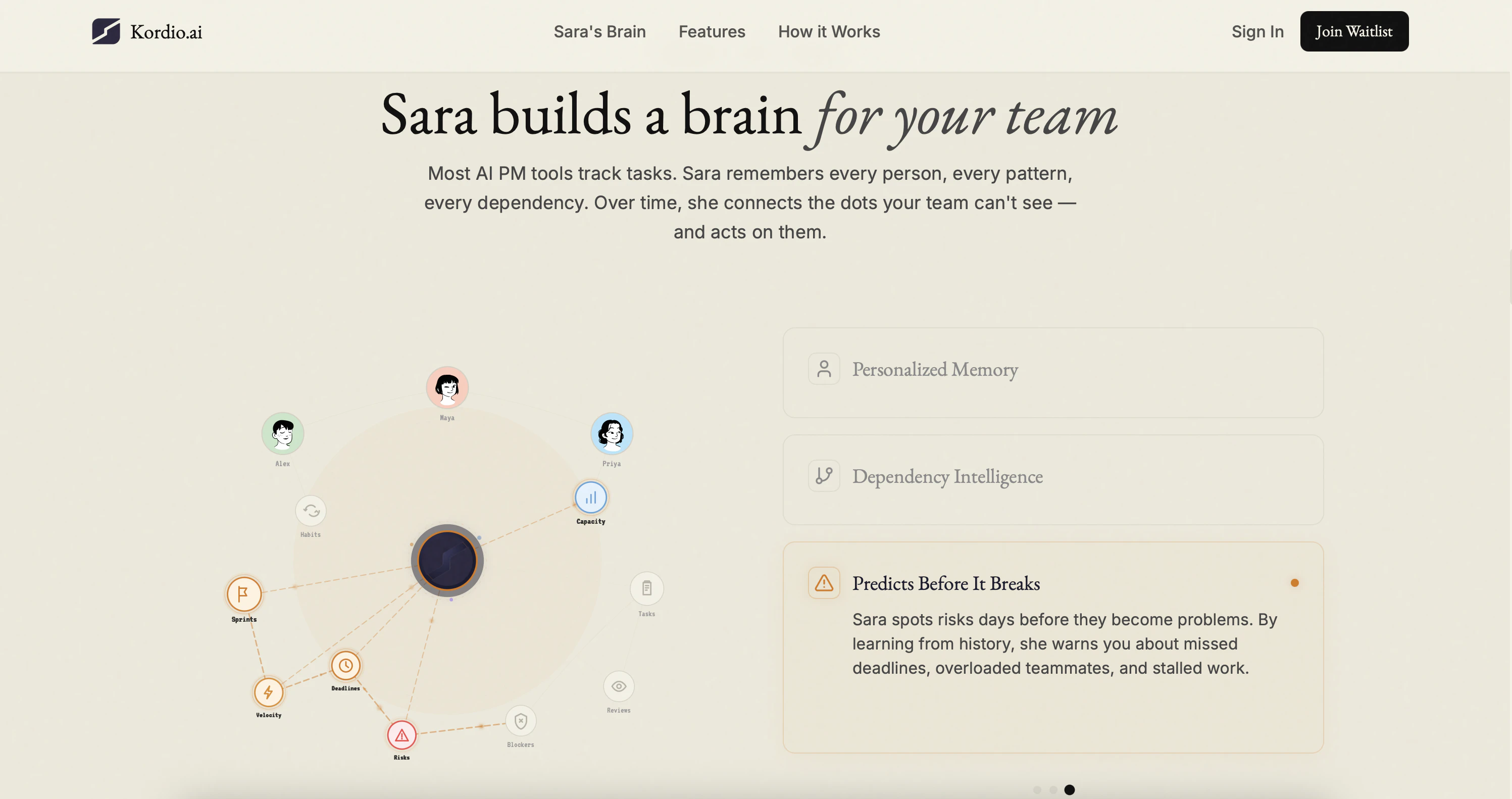Sara is the first AI that doesn't help your PM - she is the PM. She connects to Jira, GitHub, Slack, and Confluence, builds a knowledge graph of your team, and autonomously detects blockers, nudges the right people, and keeps delivery on track. Not a dashboard. Not a chatbot. An AI teammate that does the job.