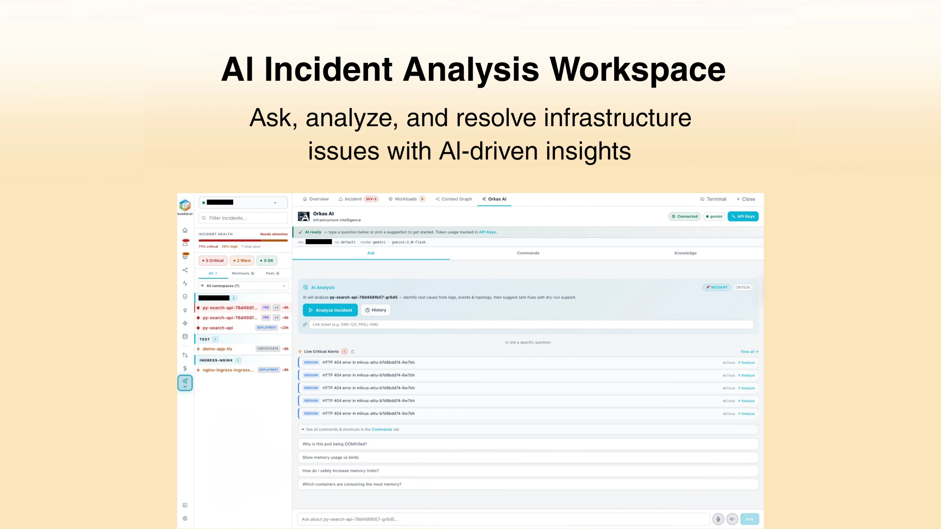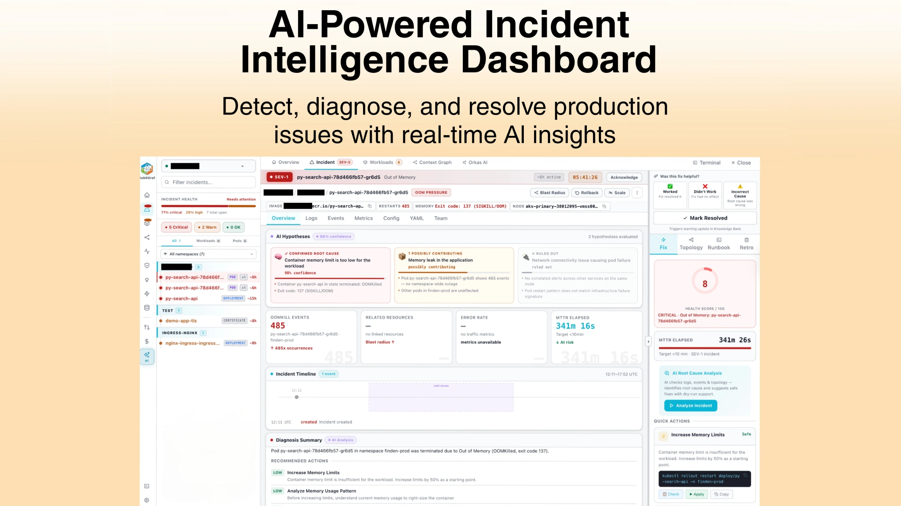 KubēGraf is a local-first AI SRE platform for Kubernetes. It finds root causes in minutes, offers SafeFix™ dry-run remediation, and self-heals issues like CrashLoopBackOff and OOMKilled - all while keeping your data inside the cluster.