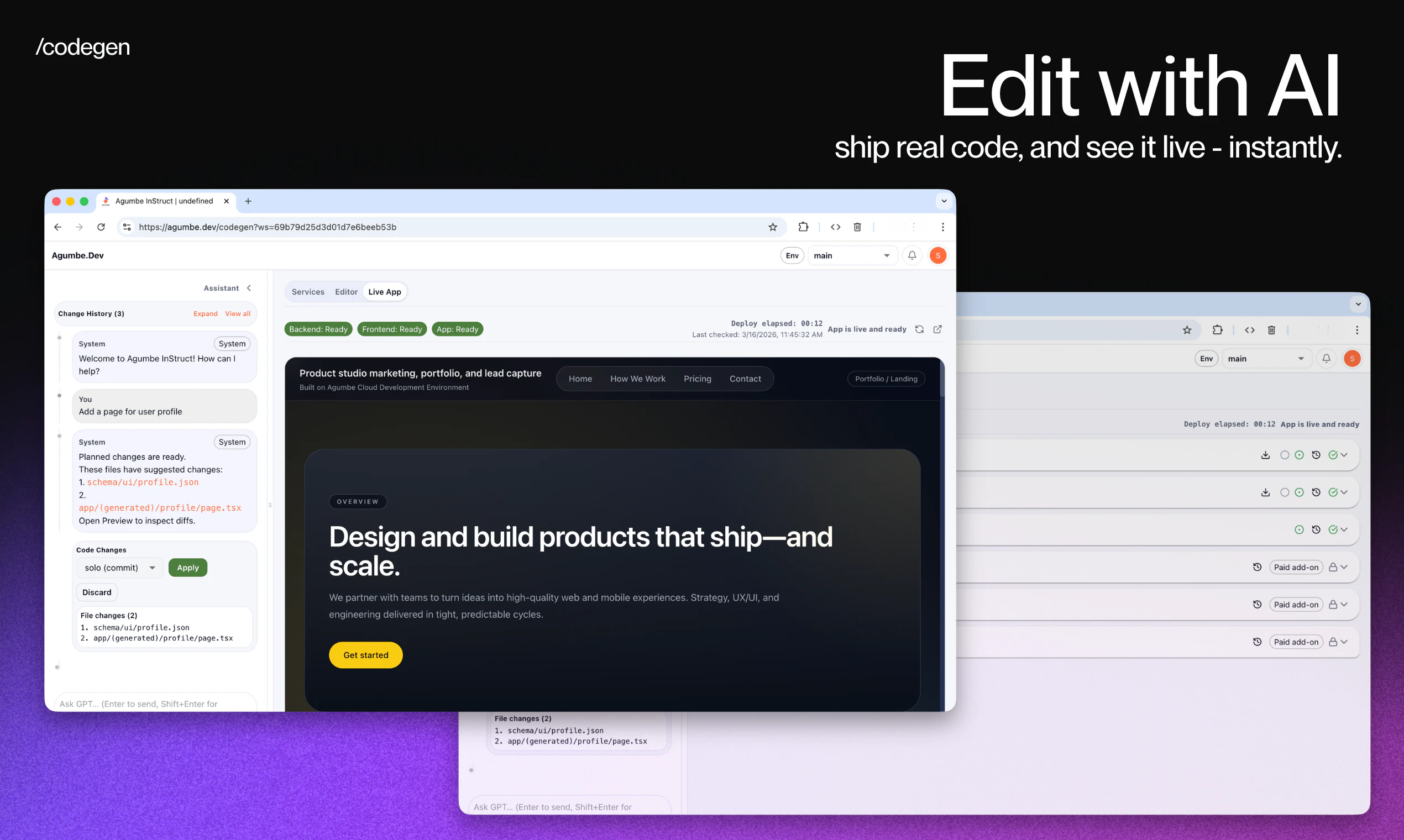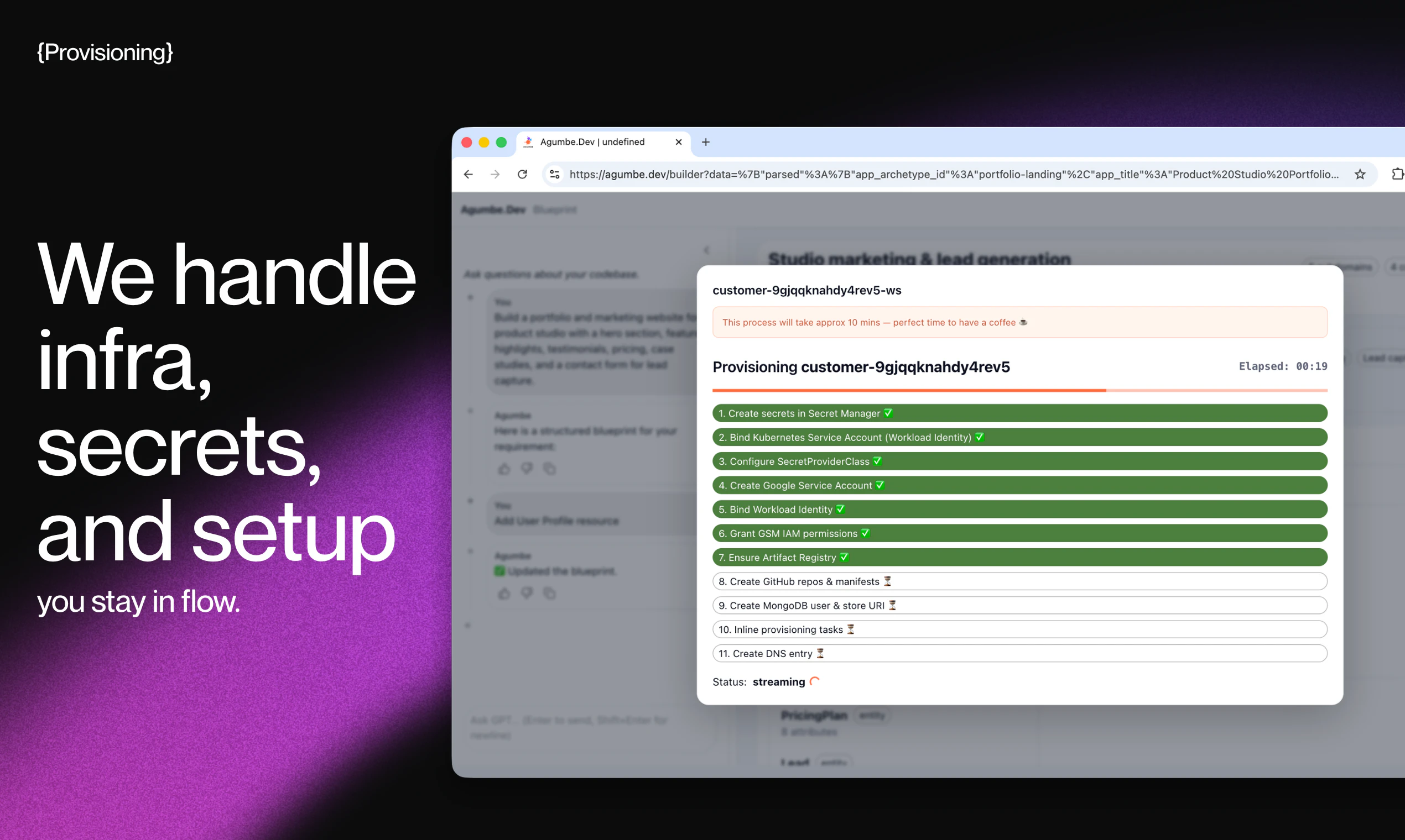 Agumbe helps teams go from idea to production-ready applications - without stitching together 10 different tools. Instead of starting with infrastructure diagrams, YAML sprawl, or templates, Agumbe gives you: - Workspace-based isolation (projects → environments → applications) - GitOps-native Kubernetes deployments powered by CD tools - AI-assisted app evolution (blueprints, codegen, and safe diffs) - Built-in CI/CD, secrets, observability, and environments