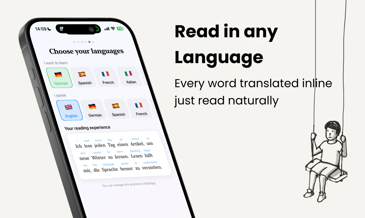 I built Lela because Duolingo didn't work for me. 400+ days of streaks and I still couldn't read a news article. Lela takes a different approach: learn by reading real content. 1. Browse articles from top news sources or share any webpage 2. Every word shows its translation inline — just read naturally 3. Tap words you know to build your vocabulary 4. Quiz yourself with flashcards made from your words No streaks. No cartoon owls. Just reading — the way languages were always meant to be learned.