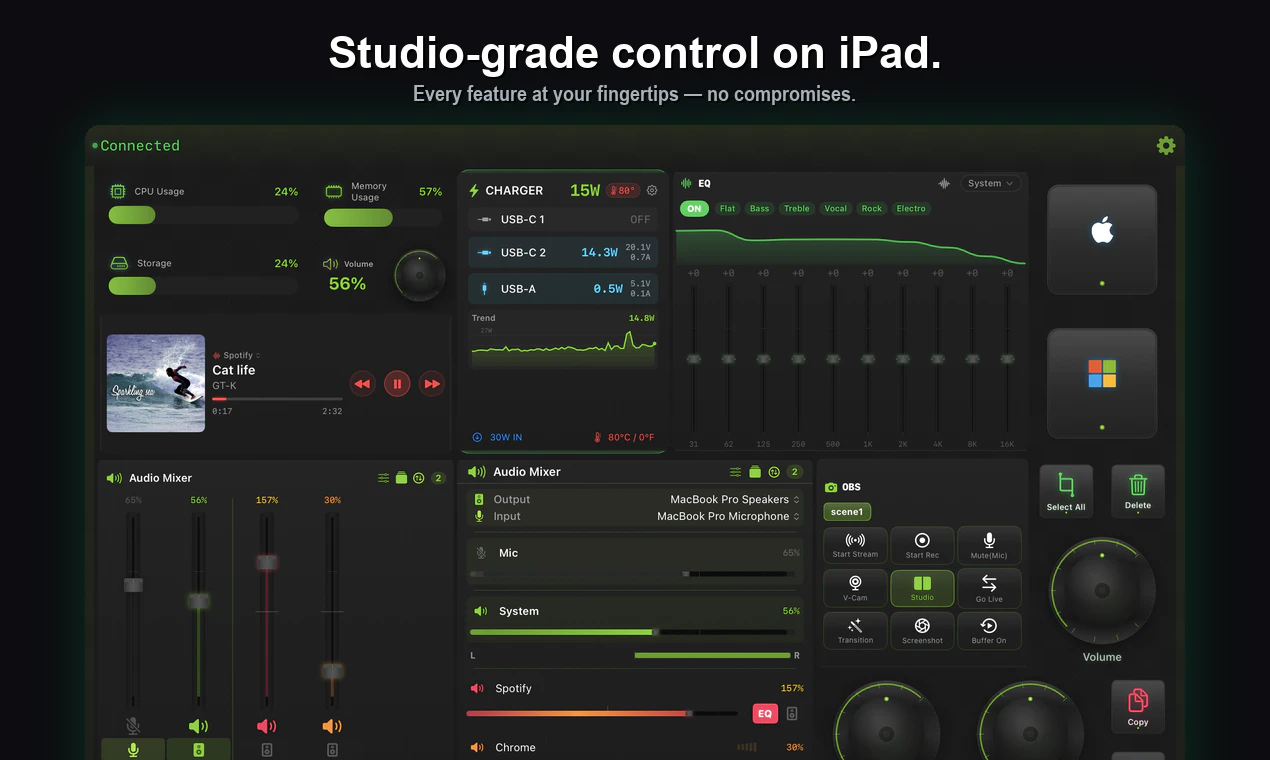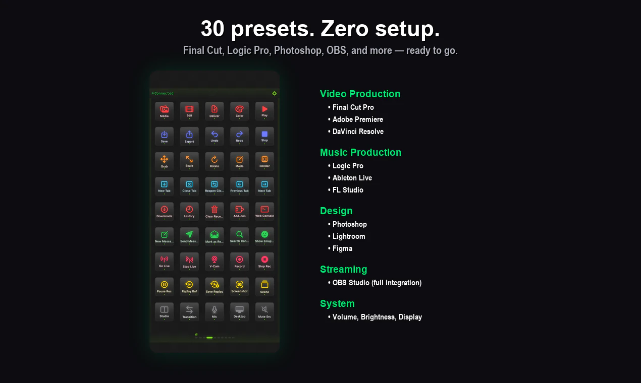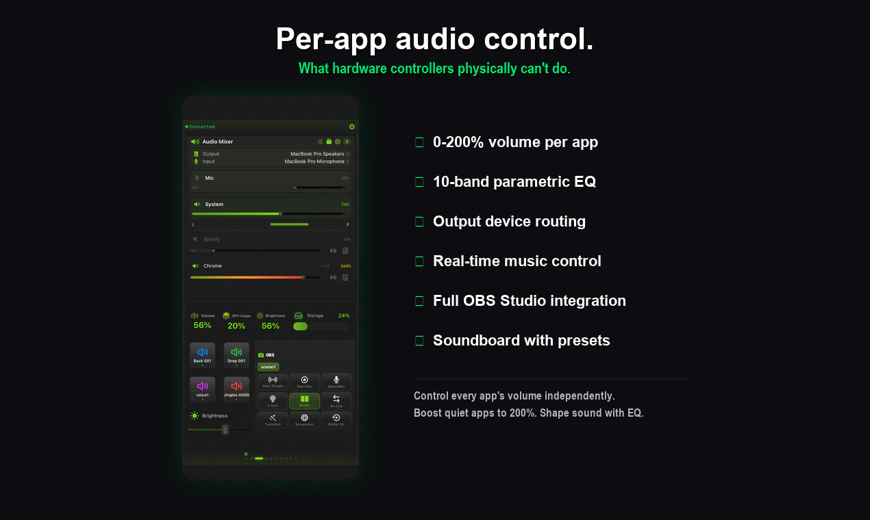 Skip the $150 Stream Deck — your iPhone is already in your pocket. StreamPad turns your iPhone/iPad into a pro control deck with buttons, dials, faders & touch strips over WiFi. 🎛️ Per-app audio mixer (10-band EQ, 0-200% volume) 🔄 Auto-switching profiles per active app 🎬 30 presets: Final Cut, Logic, Photoshop & more 📡 Full OBS Studio integration 🎨 18 custom themes Free to start. Works with Mac & Windows.