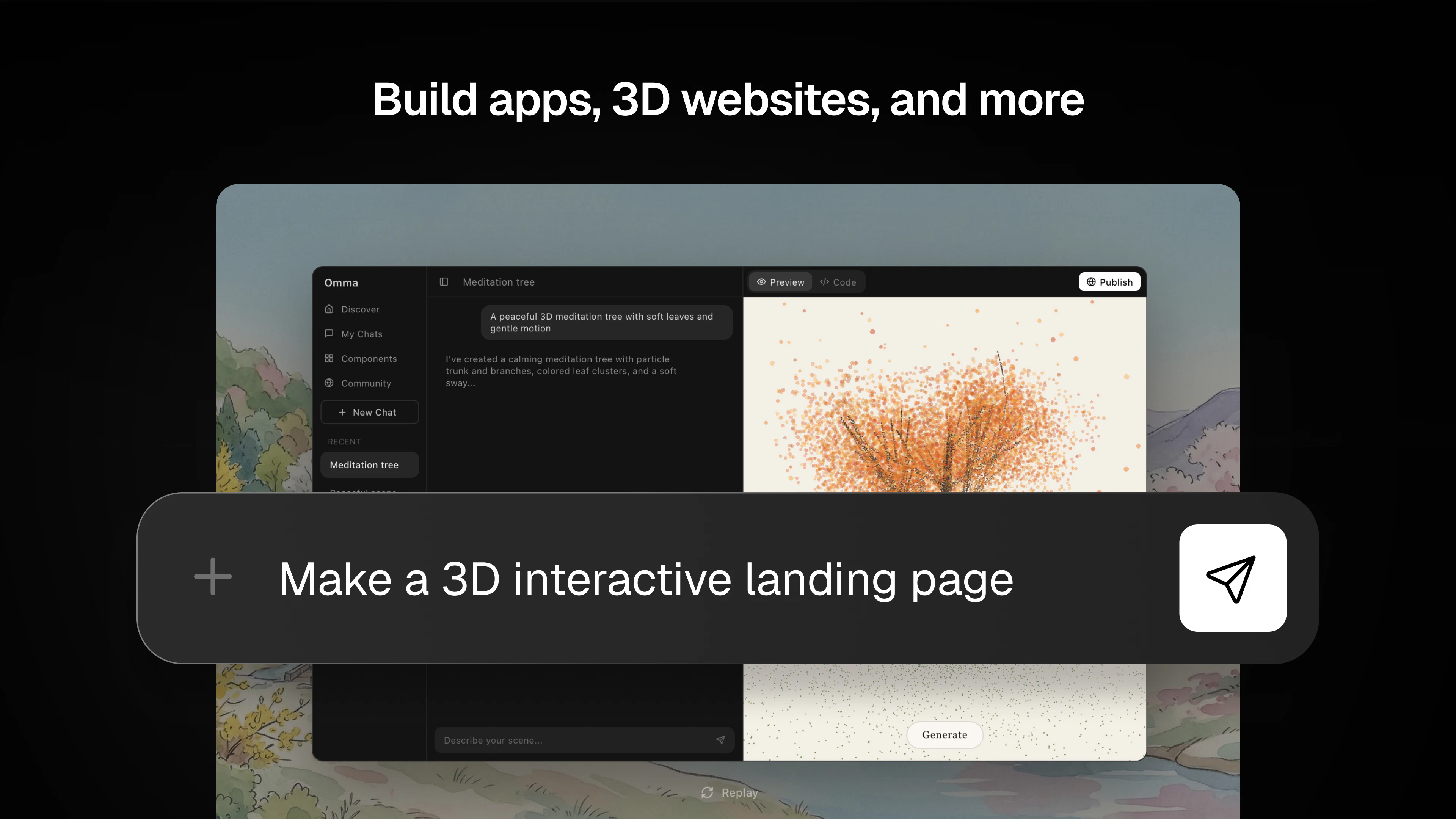 Omma combines code generation (LLMs), 3D generation (AI 3D Gen), and media generation with parallel agents to create interactive apps, websites, 3D assets, and more!
