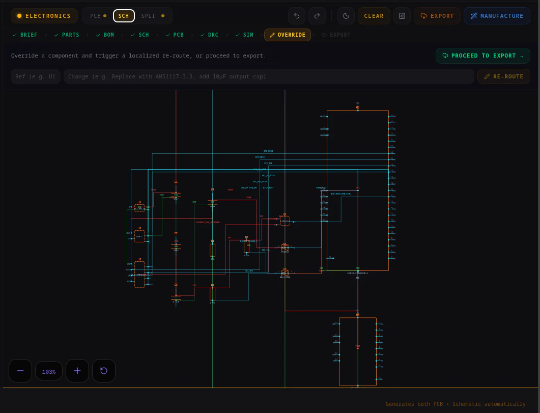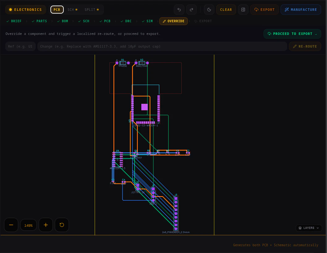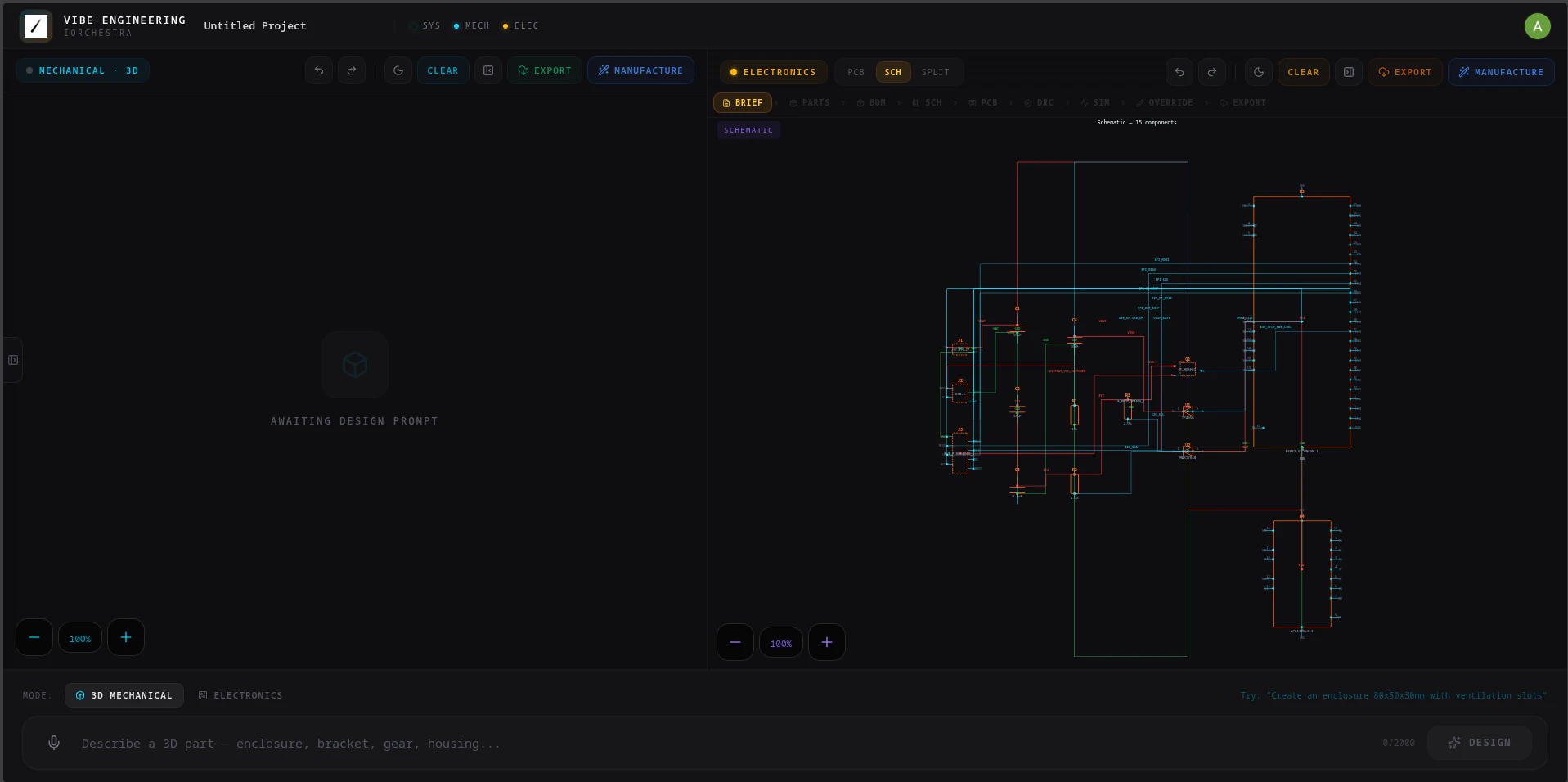Vibe Engineer gives hardware engineers two AI agents, a Mechanical Engineer and an Electrical Engineer. Describe what you want to build in plain text, pick your agent, and get a real PCB, schematic, or mechanical design instantly. Iterate with prompts, export to your preferred CAD/EDA tool, check part availability with an auto-generated BOM, or hit Manufacture to send to production and get a real-time cost quote.