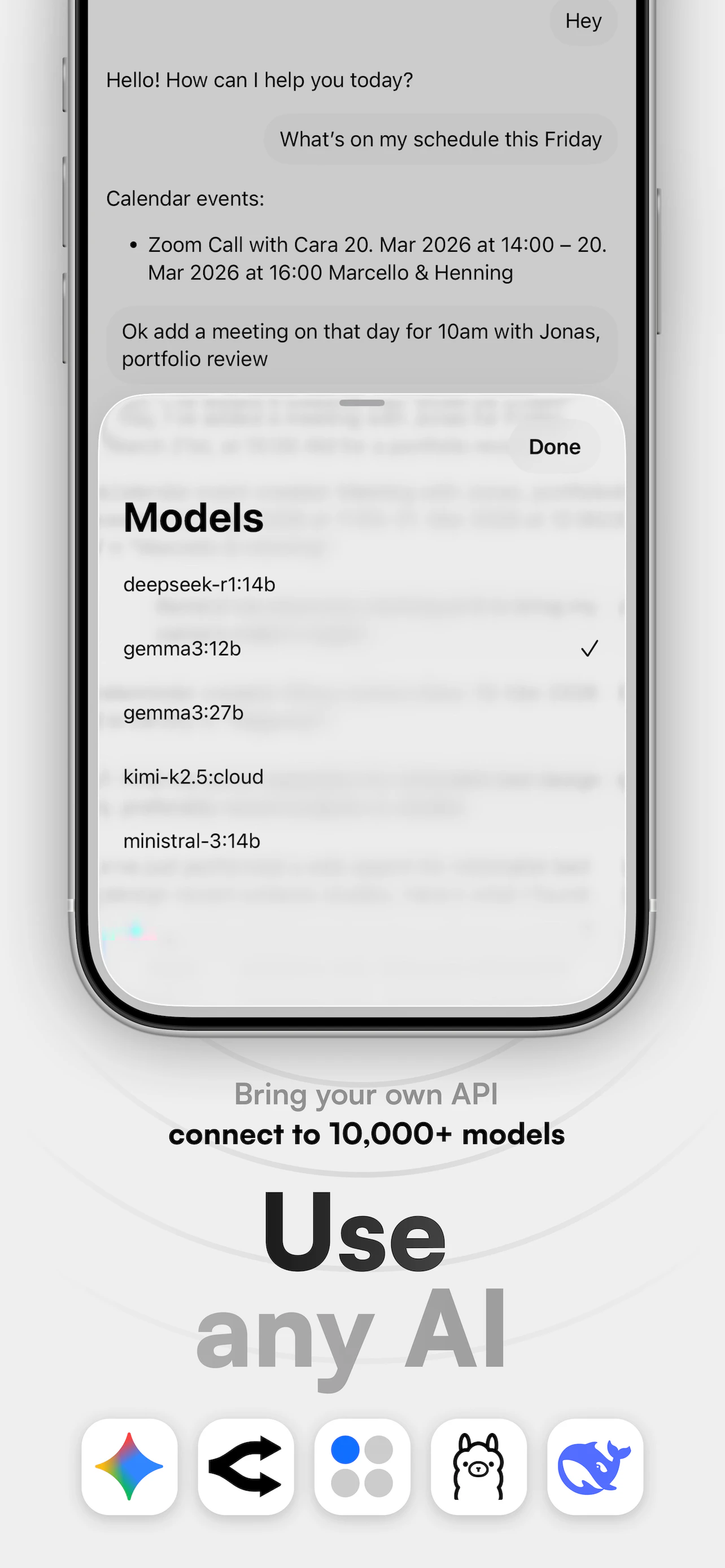 Connect your local or hosted instance using your URL and API key. All available models load automatically and you can switch between them, start new chats, or continue existing ones in a clean interface. The chat stays simple and responsive. You can add images or documents and use web search when needed. Eron also supports integrations like calendar events, reminders, Home control and email drafts. No accounts, no tracking. All data is sent only to your configured server.