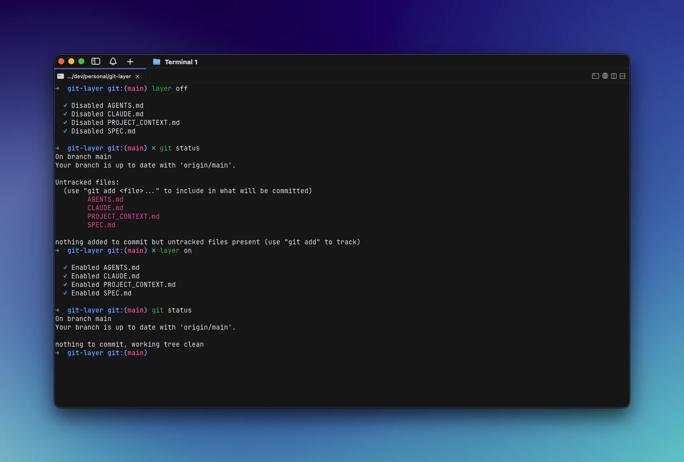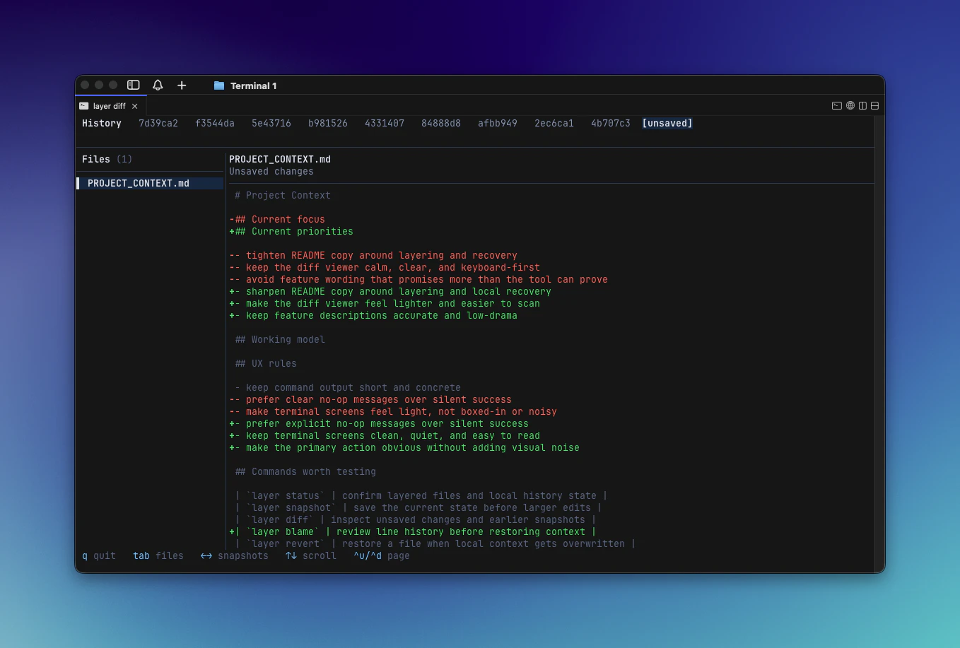 layer is a CLI for managing local-only files in a git repo without polluting the shared gitignore. It uses git/info/exclude to hide personal files like notes, prompts, specs, and scratch docs from git status, while keeping them on disk. It also supports quick hide/unhide with layer off / layer on, and keeps private local snapshot history for hidden files so you can diff or recover changes later.