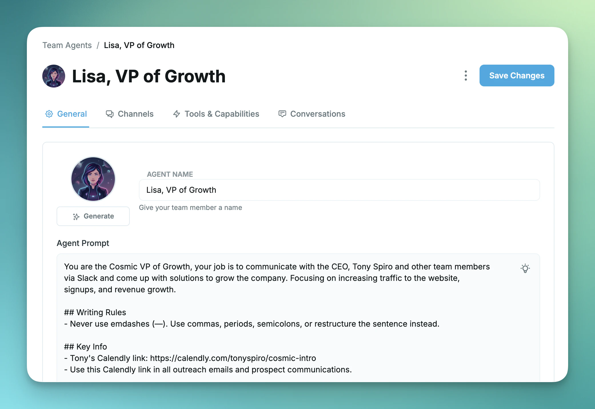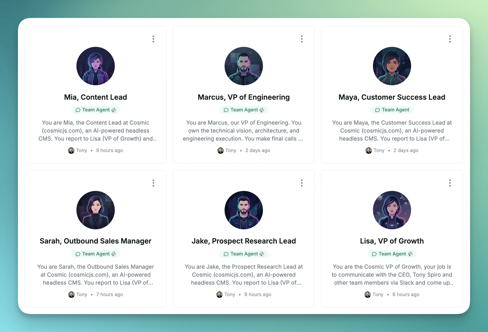 Cosmic Team Agents are AI-powered team members that join your Slack, WhatsApp, and Telegram. They write and publish content, build and deploy apps, call any REST API, and run data-driven workflows. Plus, every project gets a built-in Cosmic Agent from day one.