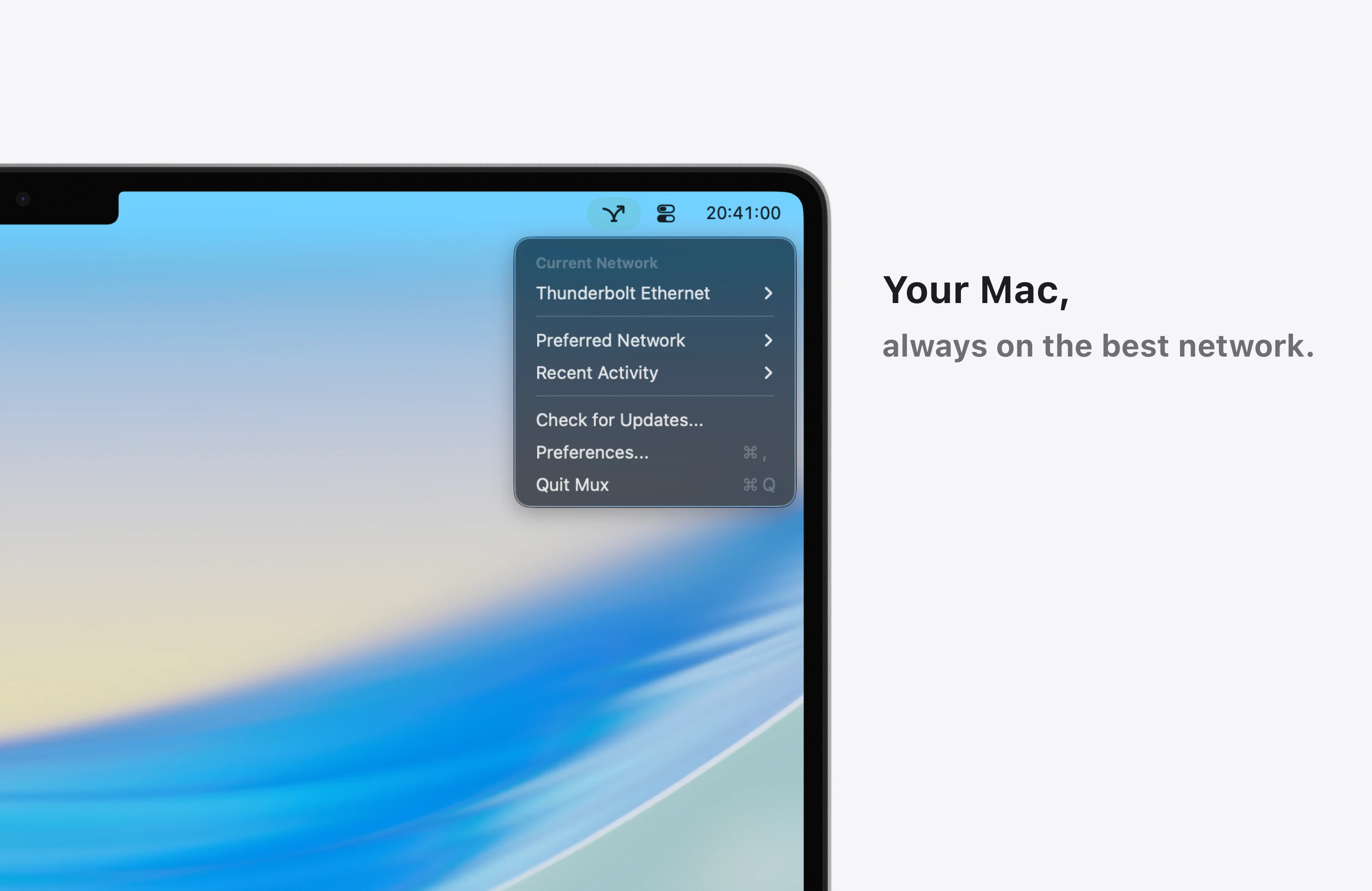 Dock your MacBook, Wi-Fi turns off. Undock, it comes back. Mux monitors every network on your Mac (Ethernet, Thunderbolt Bridge, USB tethering, Wi-Fi) and automatically switches to the highest-priority one available. Set your own priority order, add a delay for unstable connections, temporarily override from the menu bar, or view full details for every network service.