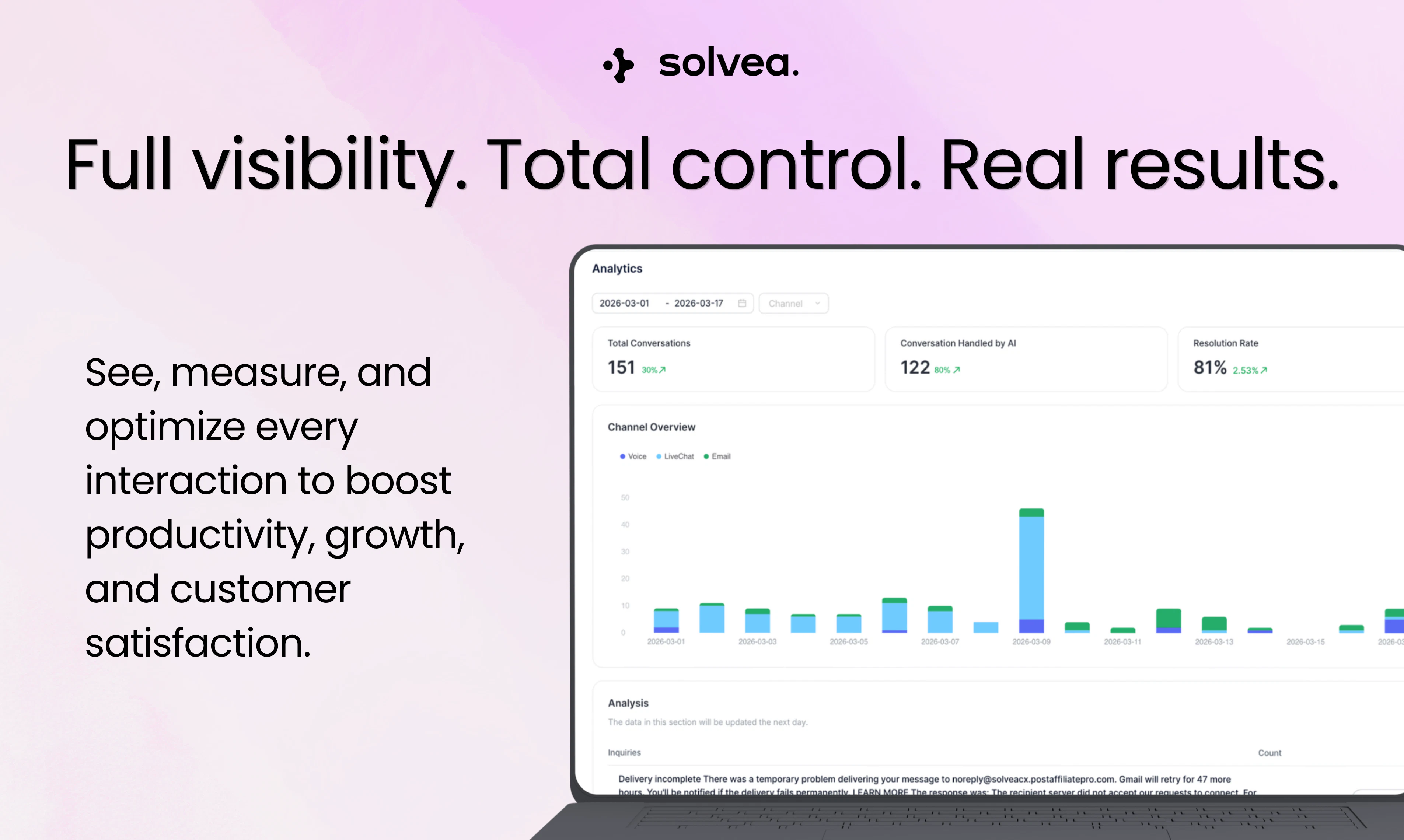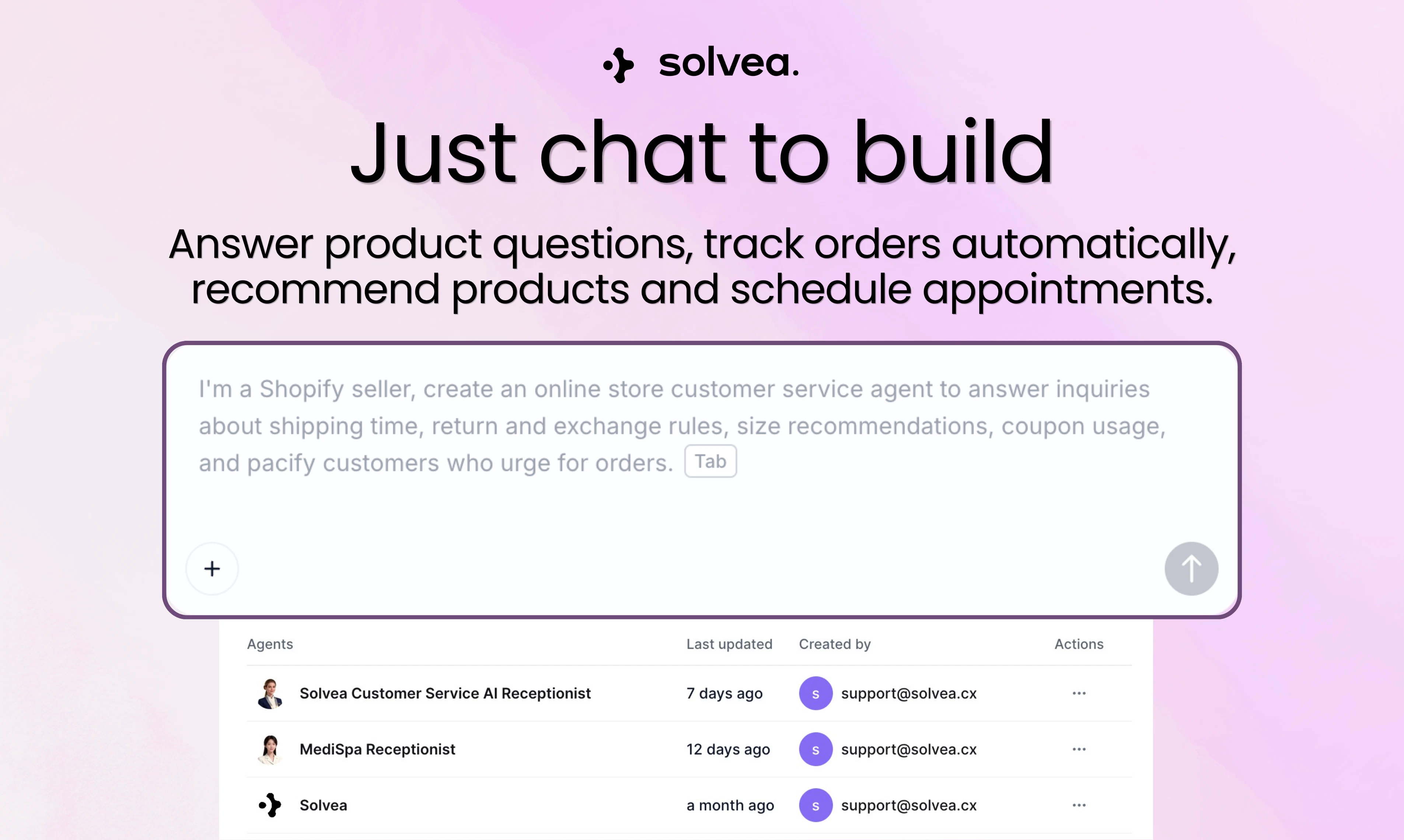 Solvea is an all-in-one platform to create your AI receptionist for support, sales, and scheduling. Unlike basic chatbots, it remembers context and takes action, so you never miss a customer. Answer questions, track orders, recommend products, and book appointments across phone, chat, and email 24/7. No coding required, just describe what you want and launch in minutes.