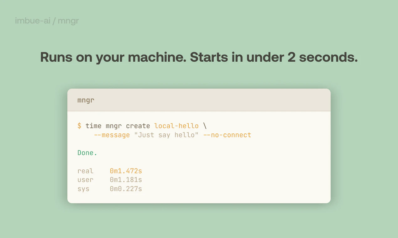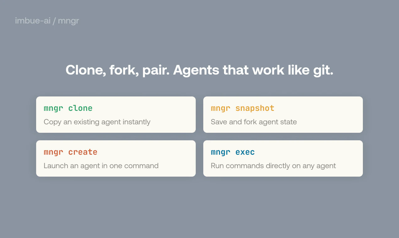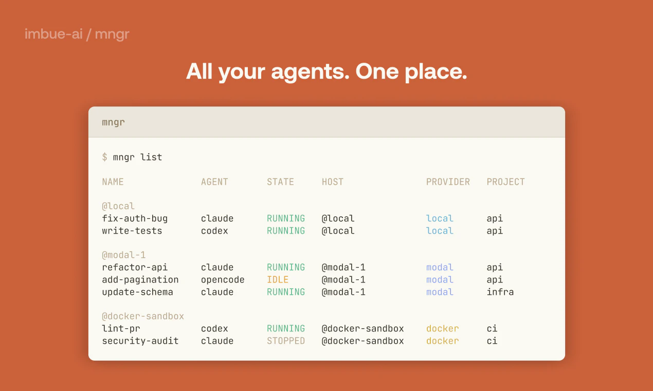 Mngr is a CLI tool for programmatically spinning up coding agents at any scale. It lets you compose workflows—fix all my tests, open PRs for every issue, validate every use case—and run them repeatedly. Run 1. Run 100s. See all your agents, and if they're blocked on you. Connect to any agent mid-task to ask a question or debug it. Agents start in under 2 seconds and shut down when idle. The same commands work with any agent harness, running locally, on Modal, or in Docker. Free and open-source.