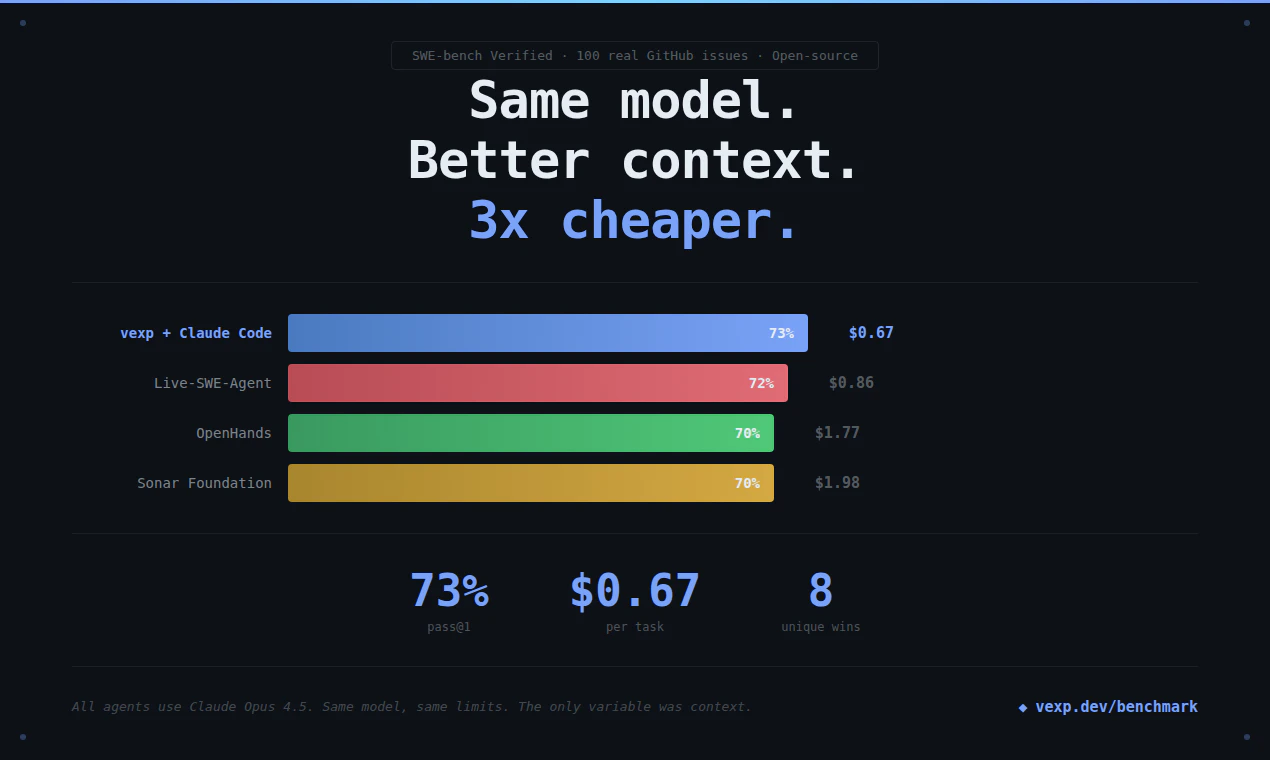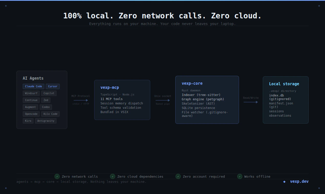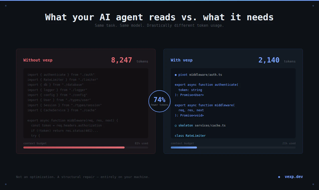 vexp gives your AI coding agent only the code that matters. It indexes your codebase into a dependency graph locally (Rust, tree-sitter, SQLite) and serves ranked context via MCP. Instead of reading entire files, the agent gets the relevant functions in full and connected symbols as skeletonized signatures. Works with Claude Code, Cursor, Copilot, and 9 more agents. 30 languages. Session memory with staleness detection. Zero cloud, zero network calls. Your code never leaves your machine.
