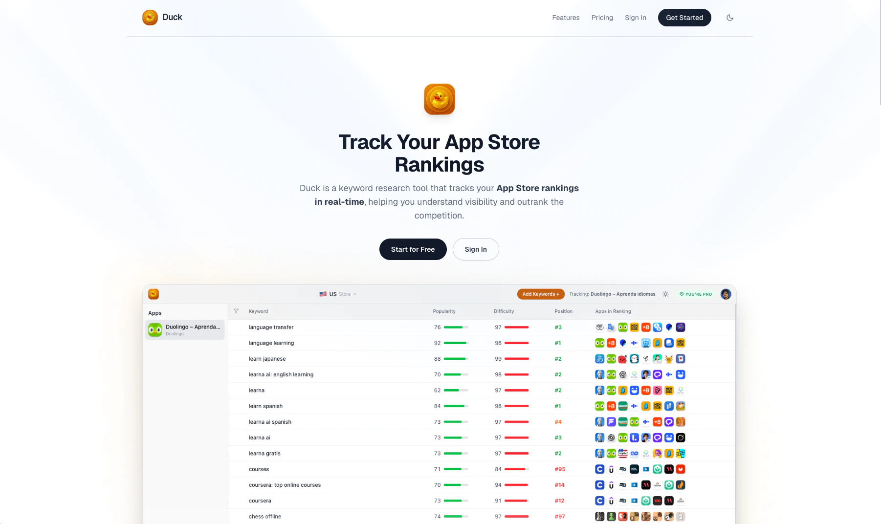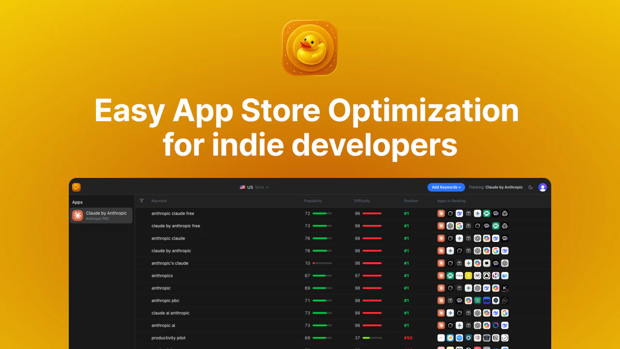 No matter how good your app is, nobody downloads what they can't find. 65% of App Store downloads come from search, and most ASO tools charge $80+/mo for dashboards you'll never use. Duck fixes that. Track keywords, see where you rank, know what competitors rank for. Real-time data across 15+ countries. Click any app, extract its keywords instantly. Free to start, Pro at $10/mo. Simple, fast, built for indie devs.
