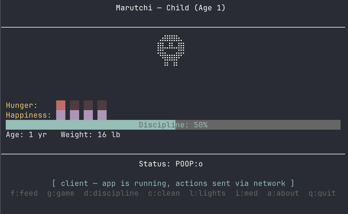 Inspired by the 1996 Tamagotchi, now programmable by AI agents. Care for your pet via desktop, terminal, or MCP. Desktop: pixel LCD UI with clickable icons, system tray, background ticks, notifications, always on top so your pet stays visible. Terminal: standalone or connected client, single binary, zero dependencies. AI Agent: MCP server lets agents feed, play, and care for your pet with per action permissions and rate limits.