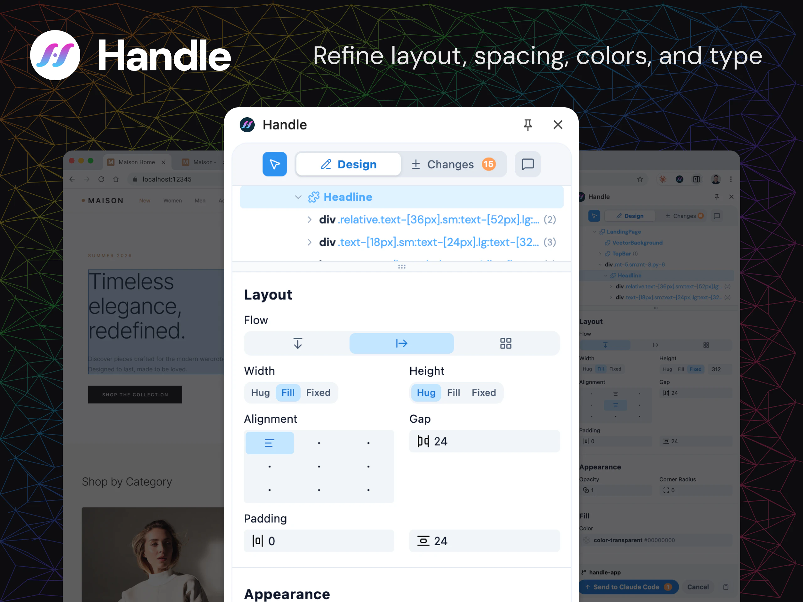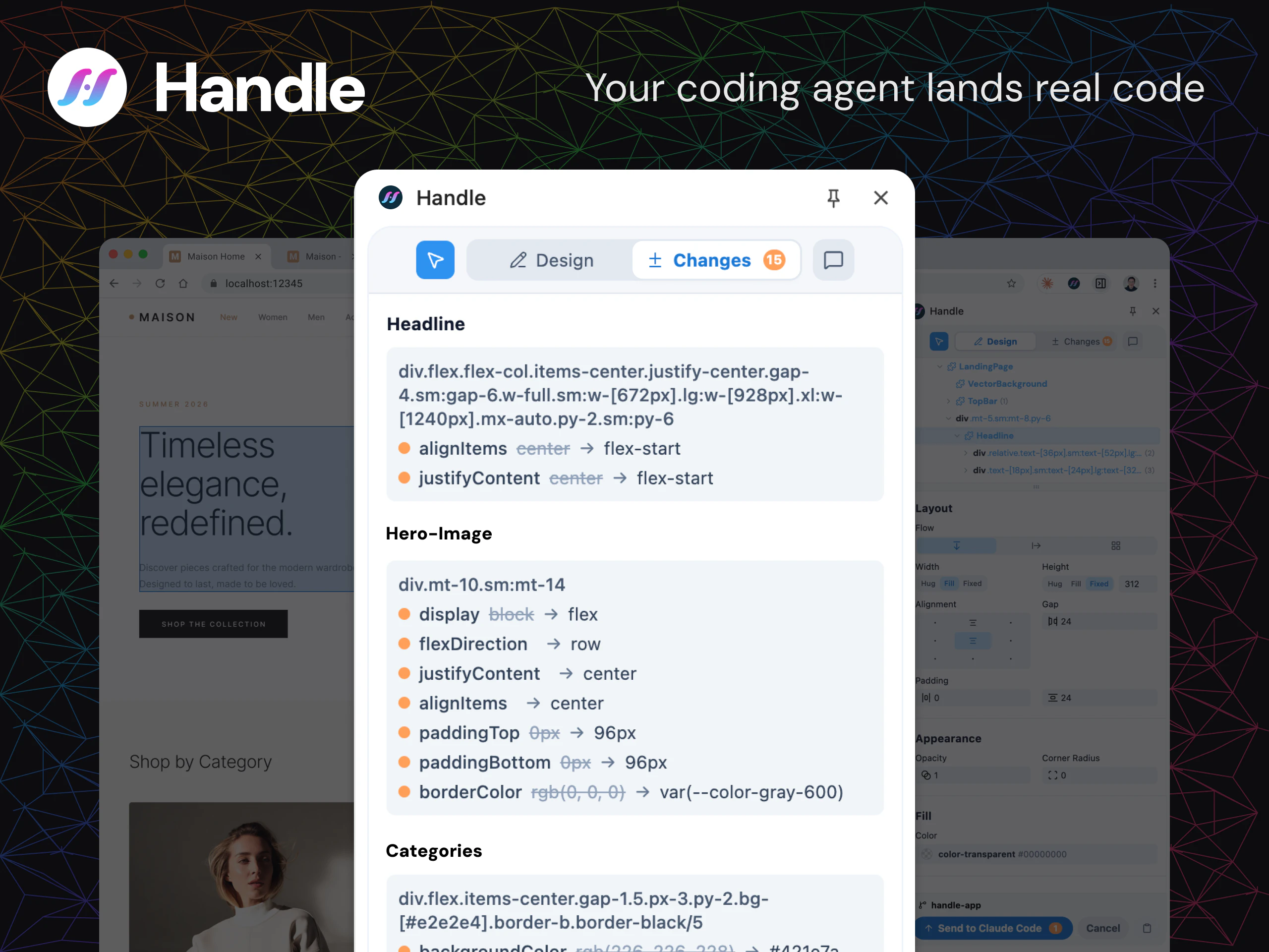 Point and fix. Refine UI directly in your browser instead of endlessly re-prompting your agent. Works with Claude Code, Codex, Cursor and others.