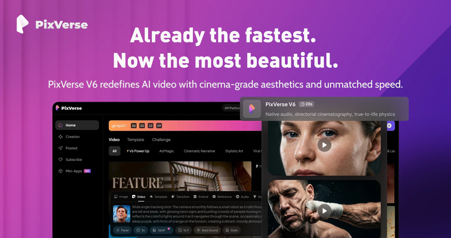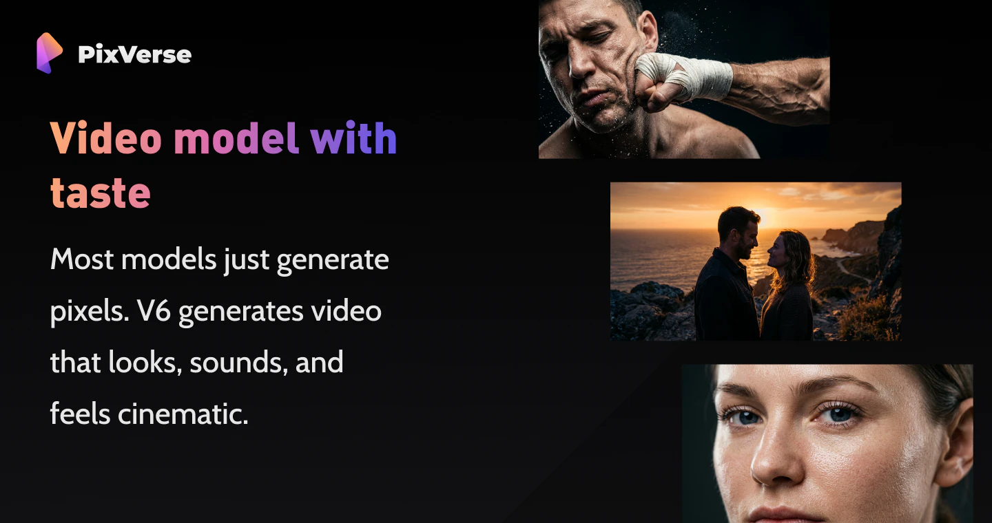 Introducing PixVerse V6: The new standard for realistic AI video. Experience unmatched human textures, natural physics, and cinematic color. We’ve mastered complex scenes—delivering high success rates for intense action, transforms, and bullet-time, all with perfectly synced audio. Plus, our new Team Plan offers shared credits for studios, and Mini Apps let you turn simple photos into polished video ads instantly!