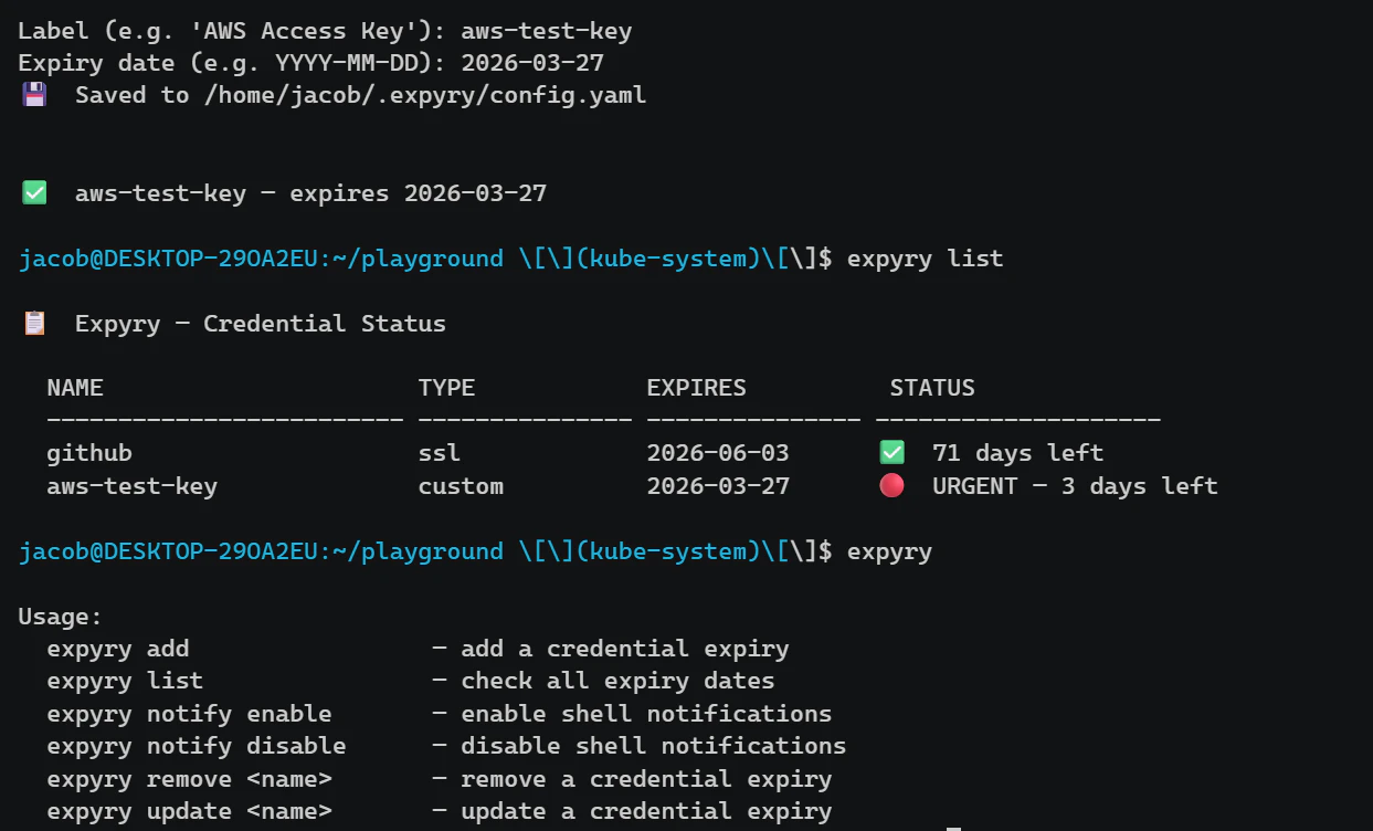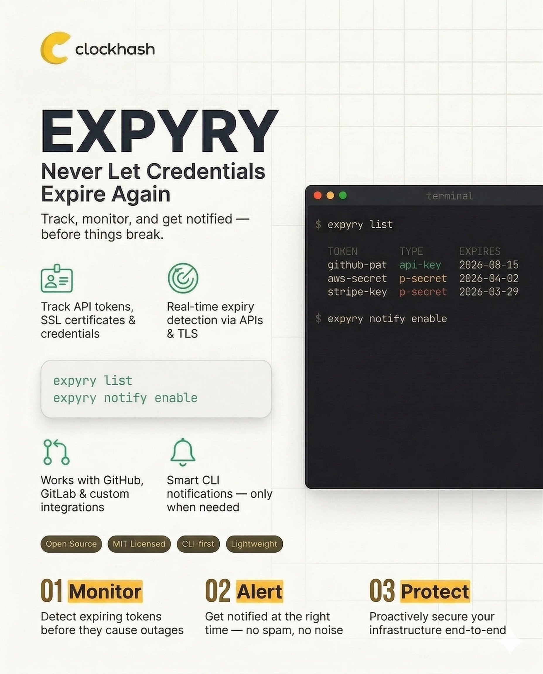 A lightweight CLI tool to track and monitor credential & token expiry dates across your stack. Expyry can silently check your credential expiry dates every time you open a terminal and warns you only when something is expiring soon.