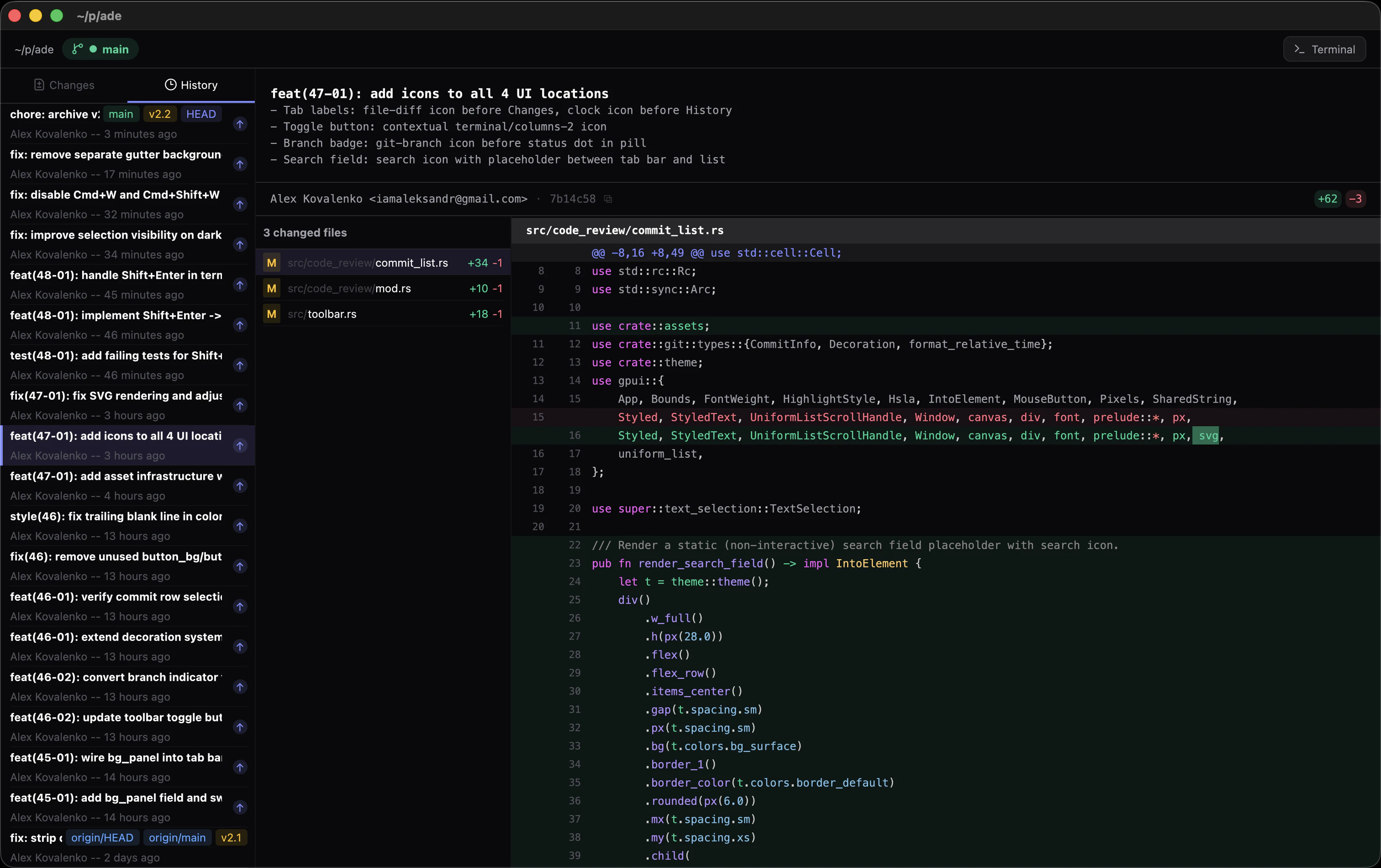 ADE is a GPU-accelerated macOS terminal with a built-in code review panel. Hit Cmd+G to open a 3-panel view of commit history, changed files, and syntax-highlighted diffs — without ever leaving your terminal. Stay in flow. Zero configuration. Replaces your terminal entirely. Built with GPUI (Zed's framework), alacritty_terminal, and tree-sitter. Rust. MIT licensed.