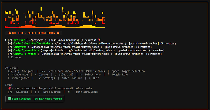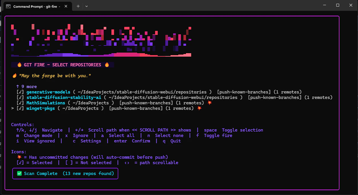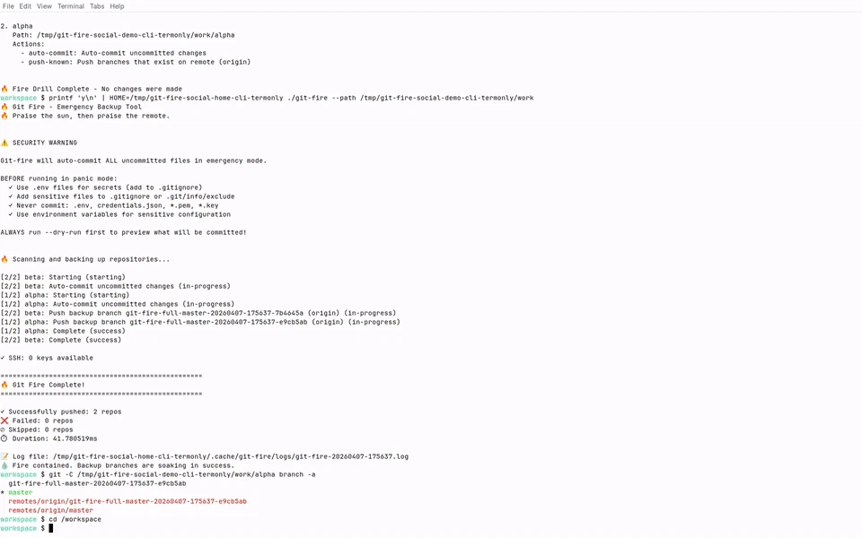 One command to back up every Git repo you have. Discovers repos, auto-commits dirty work, and pushes backup branches — safely. 🔥 Dry-run first, push second · 🔥 Streaming pipeline — backup starts before scan finishes · 🔥 Secret detection before any auto-commit · 🔥 No force-push · 🔥 Plugin support · 🔥 Structured logs, 250+ tests · 🔥 Bubble Tea TUI with fire animation Built from the old "in case of fire: git commit, git push, leave building" meme. Rebuilt properly. Beta. MIT.