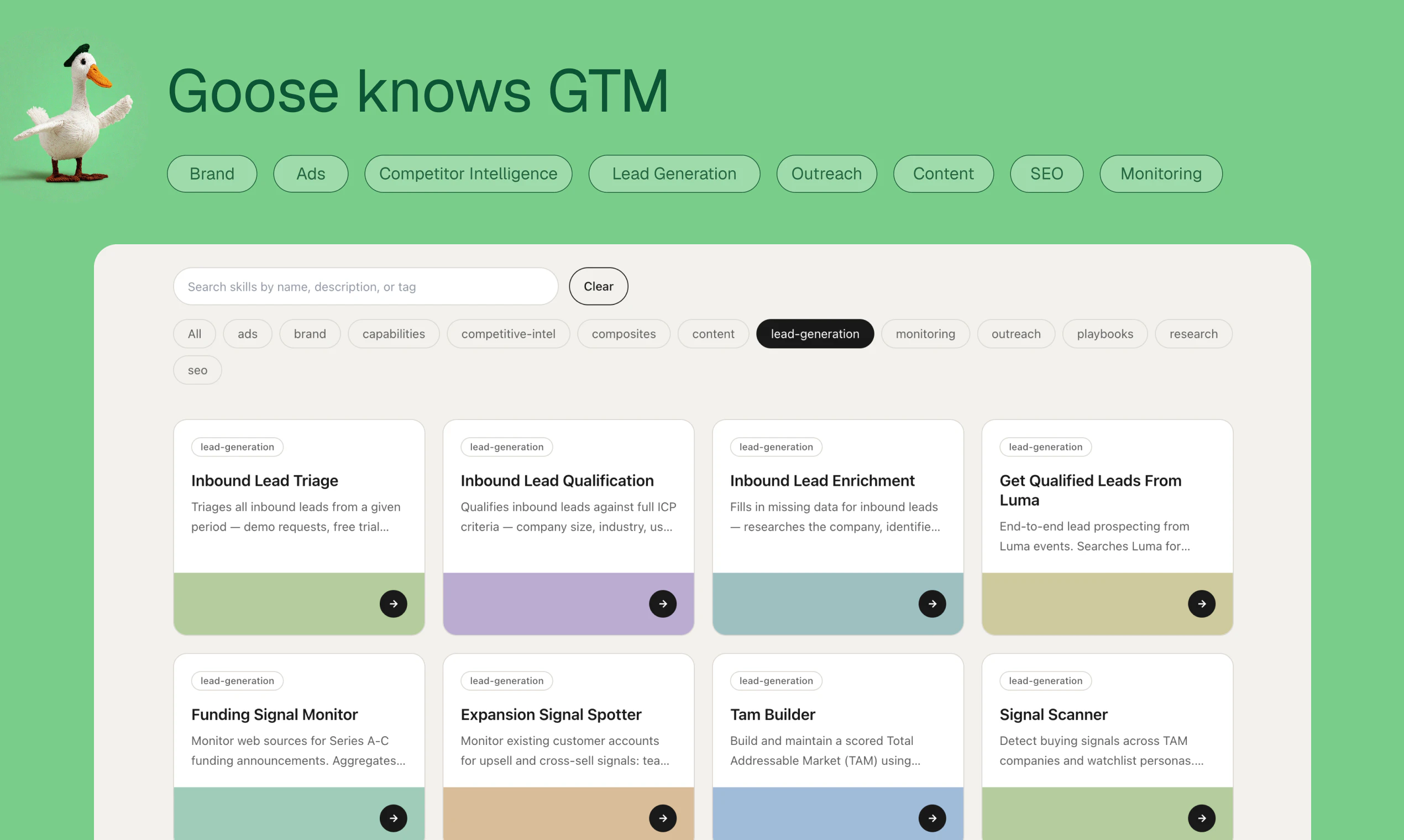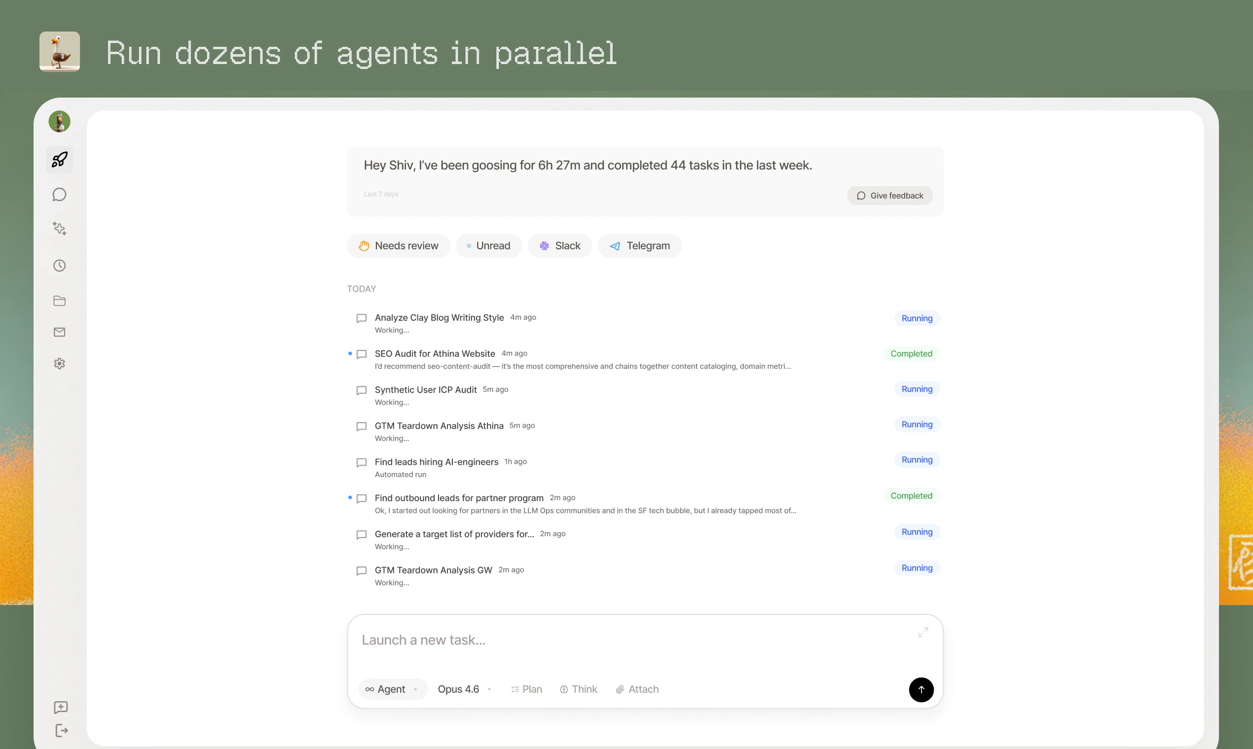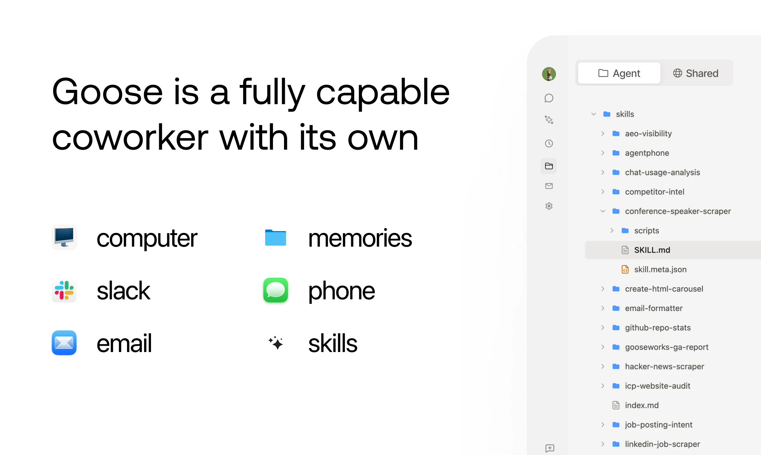 Goose is an AI coworker with its own computer, email, and memory. It does real GTM work – like run outbound campaigns, audit SEO, build lead lists, create content, and monitor competitors. Talk to Goose from Slack, email, iMessage, or the web app. It remembers your business context, learns your preferences, and gets better over time.