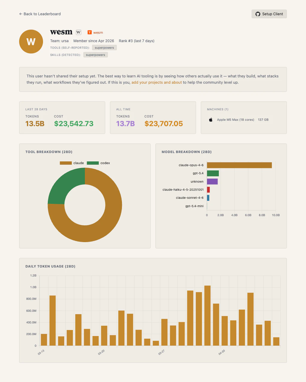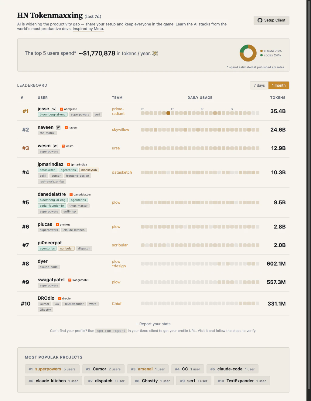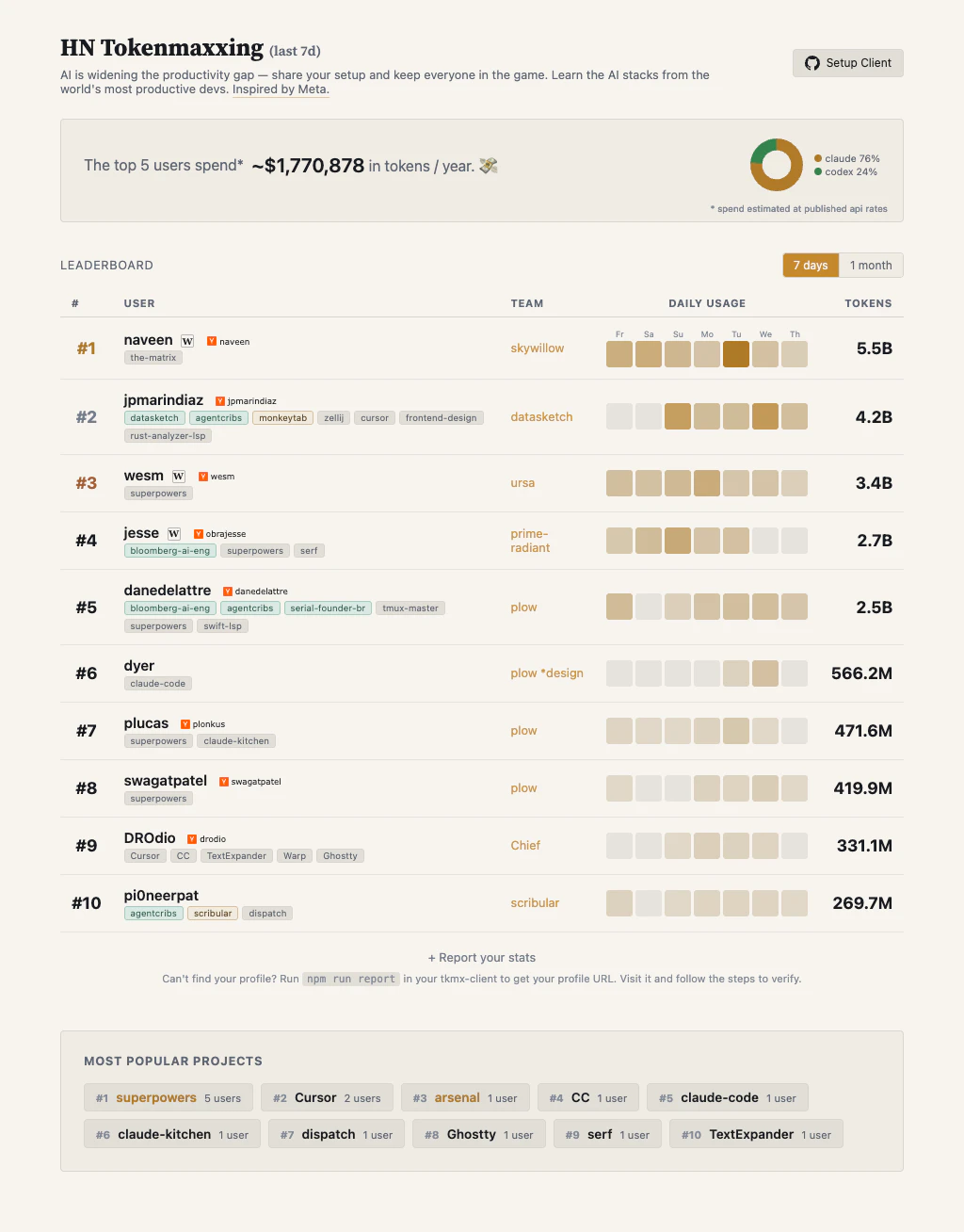 The co-founder of Foursquare, the creator of pandas & Apache Arrow, the creator of Datasketch, and the builder of Superpowers (144k+ stars) are all on one leaderboard. Tokenmaxxing is how developers share their Claude and Codex usage — and the tools driving their output. See what the top devs are running, share your own stack, and help the whole community level up.