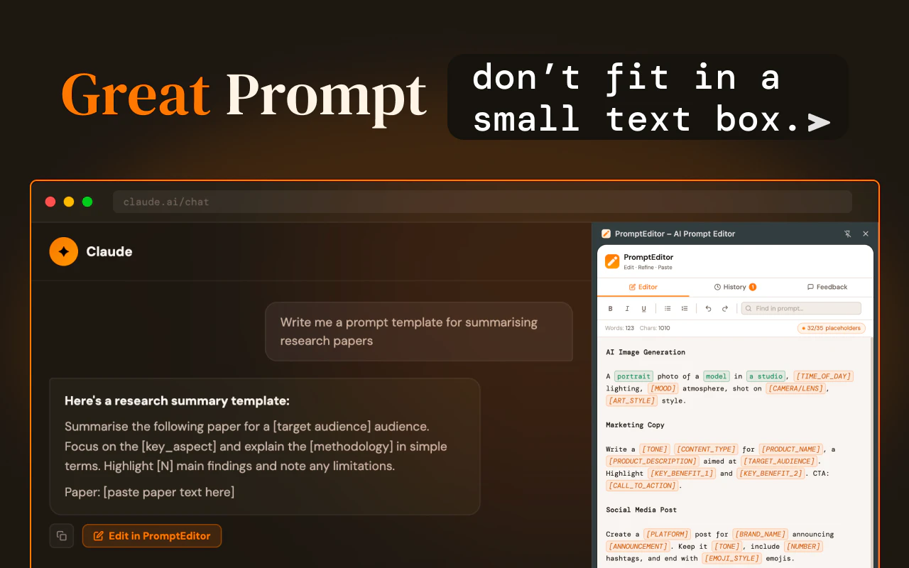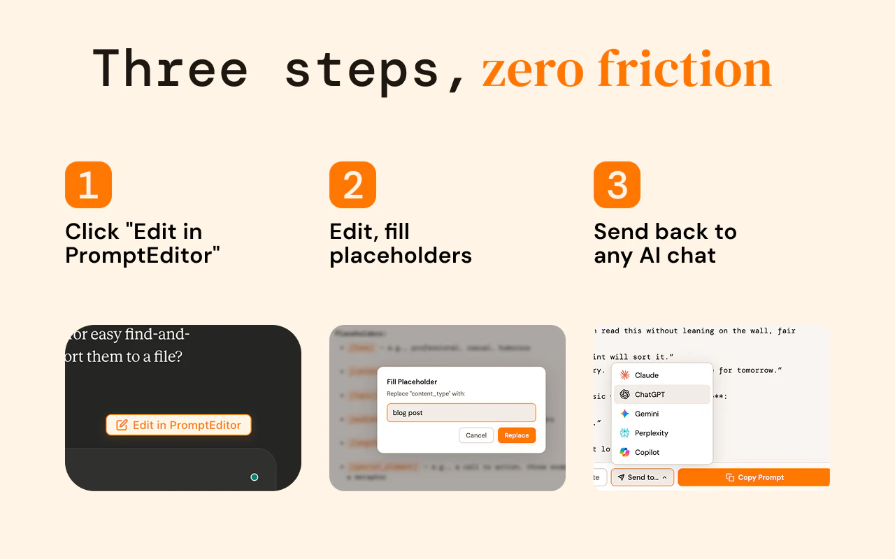 PromptEditor adds an "Edit in PromptEditor" button to every AI response on ChatGPT, Claude, Gemini, Perplexity, and Copilot. One click sends the response into a Markdown sidebar where you can refine, fill placeholders, and send it directly back to any AI chat — without ever leaving the page.