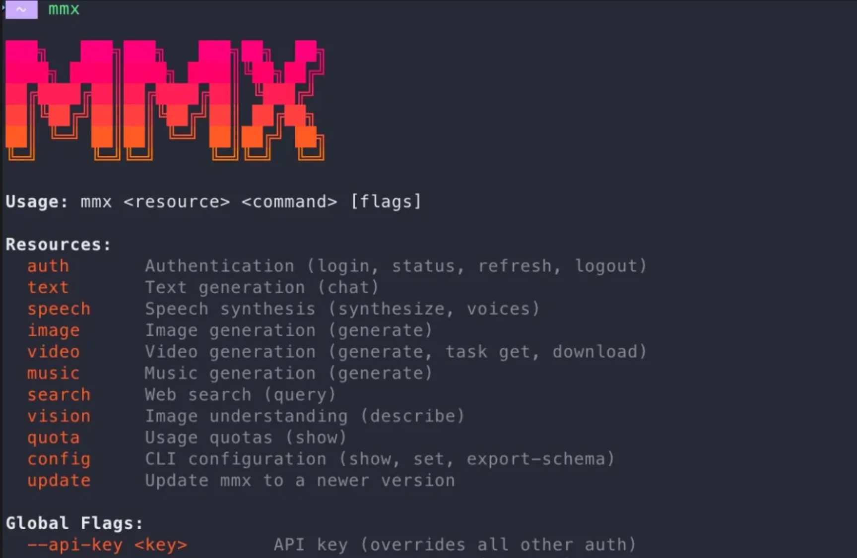 MMX-CLI is MiniMax’s official CLI for AI agents and terminals. It exposes text, image, video, speech, music, vision, and search through one command surface, with agent-oriented design like clean stdout, semantic exit codes, async jobs, and seamless Token Plan integration.