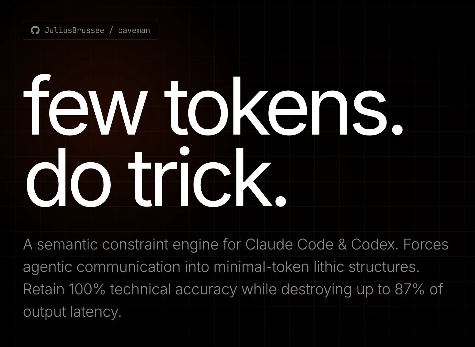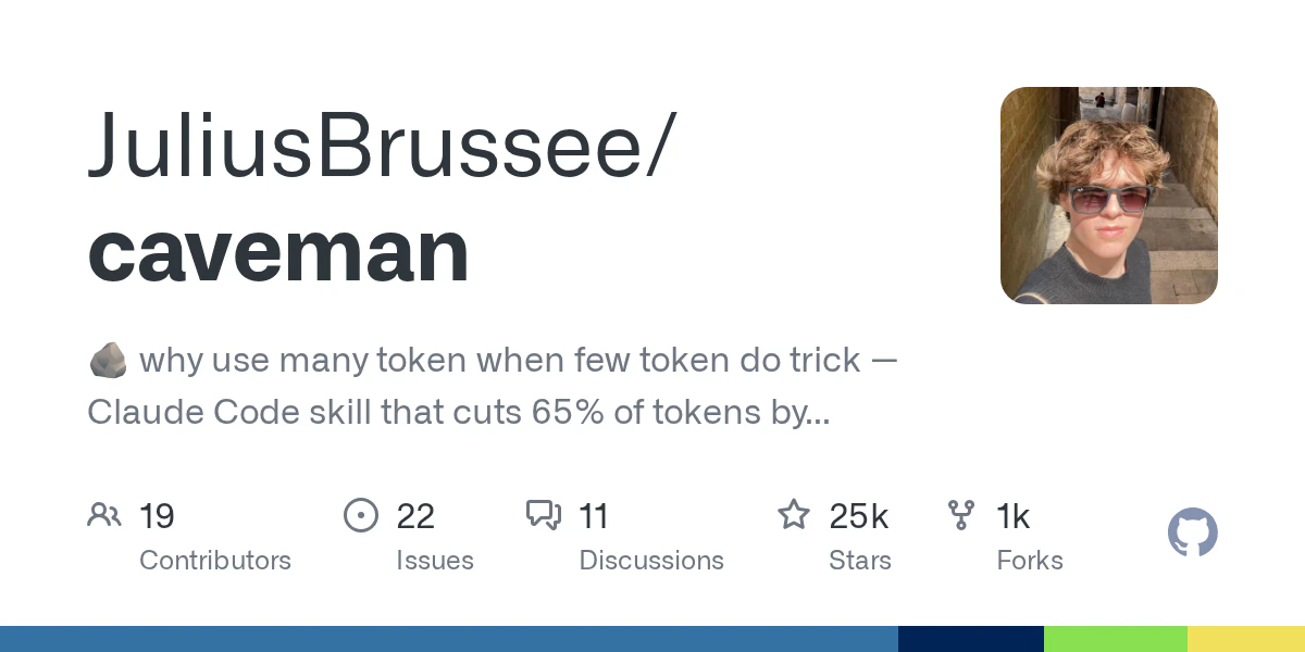 Caveman cuts ~75% of Claude's output tokens without losing technical accuracy. One-line install for Claude Code, Cursor, Windsurf, Copilot, and more. Four grunt levels, terse commits, one-line PR reviews, and input compression built in. 24.9K stars.