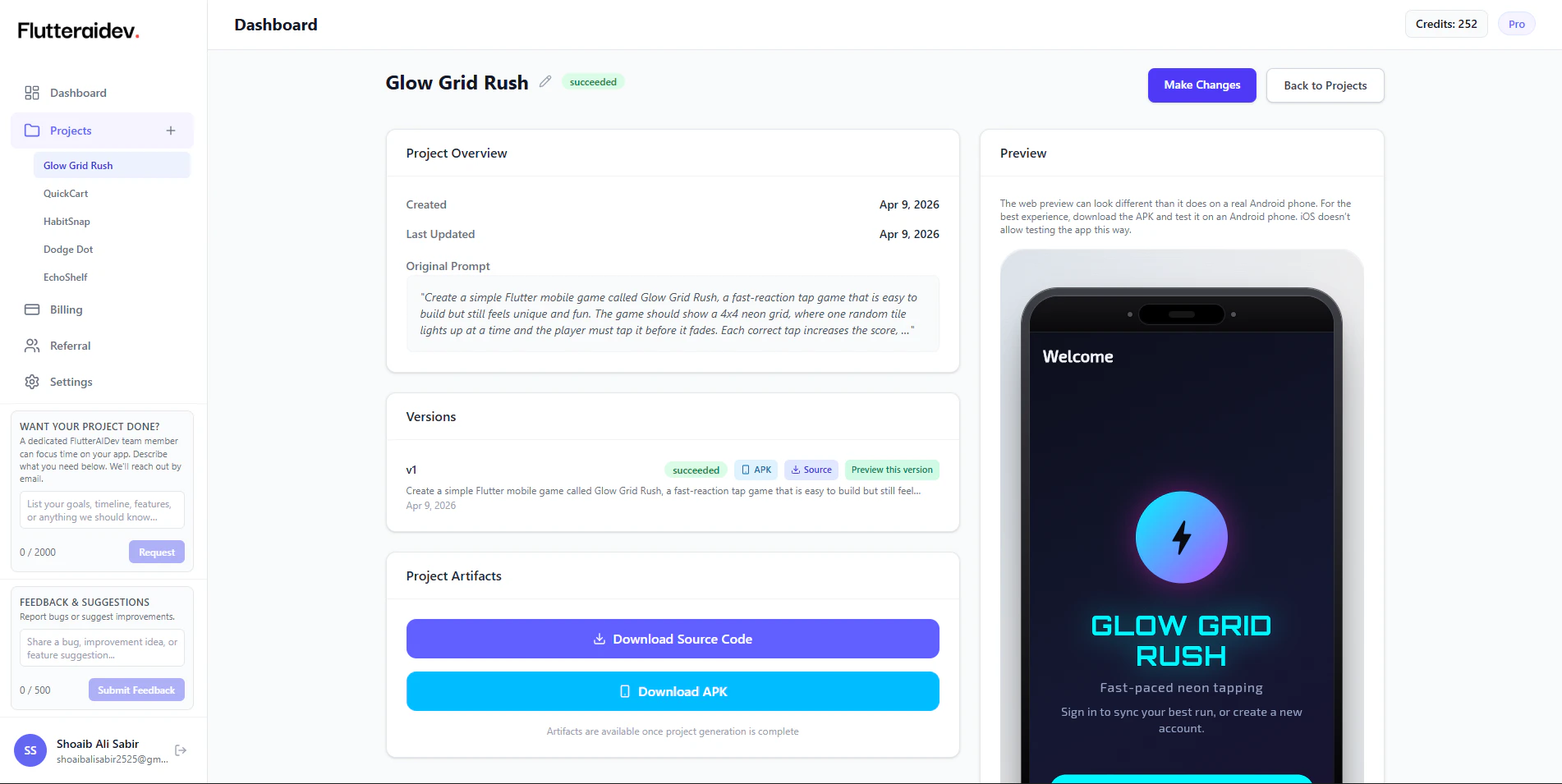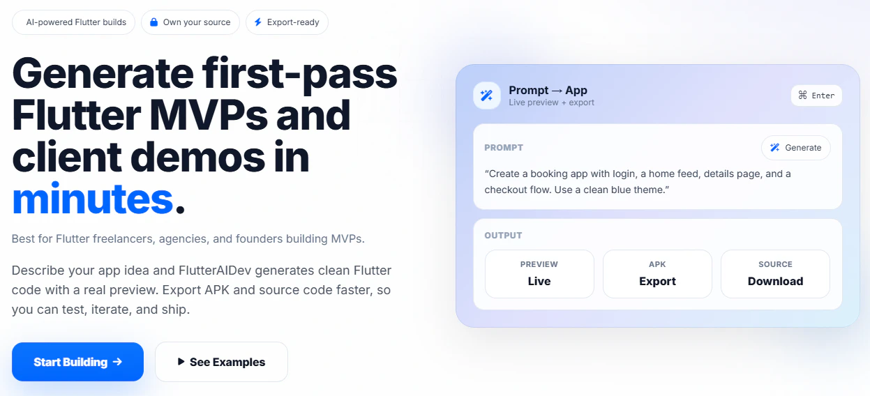 Describe your app idea and FlutterAIDev generates clean Flutter code with a real preview. Export APK and source code faster, so you can test, iterate, and ship.