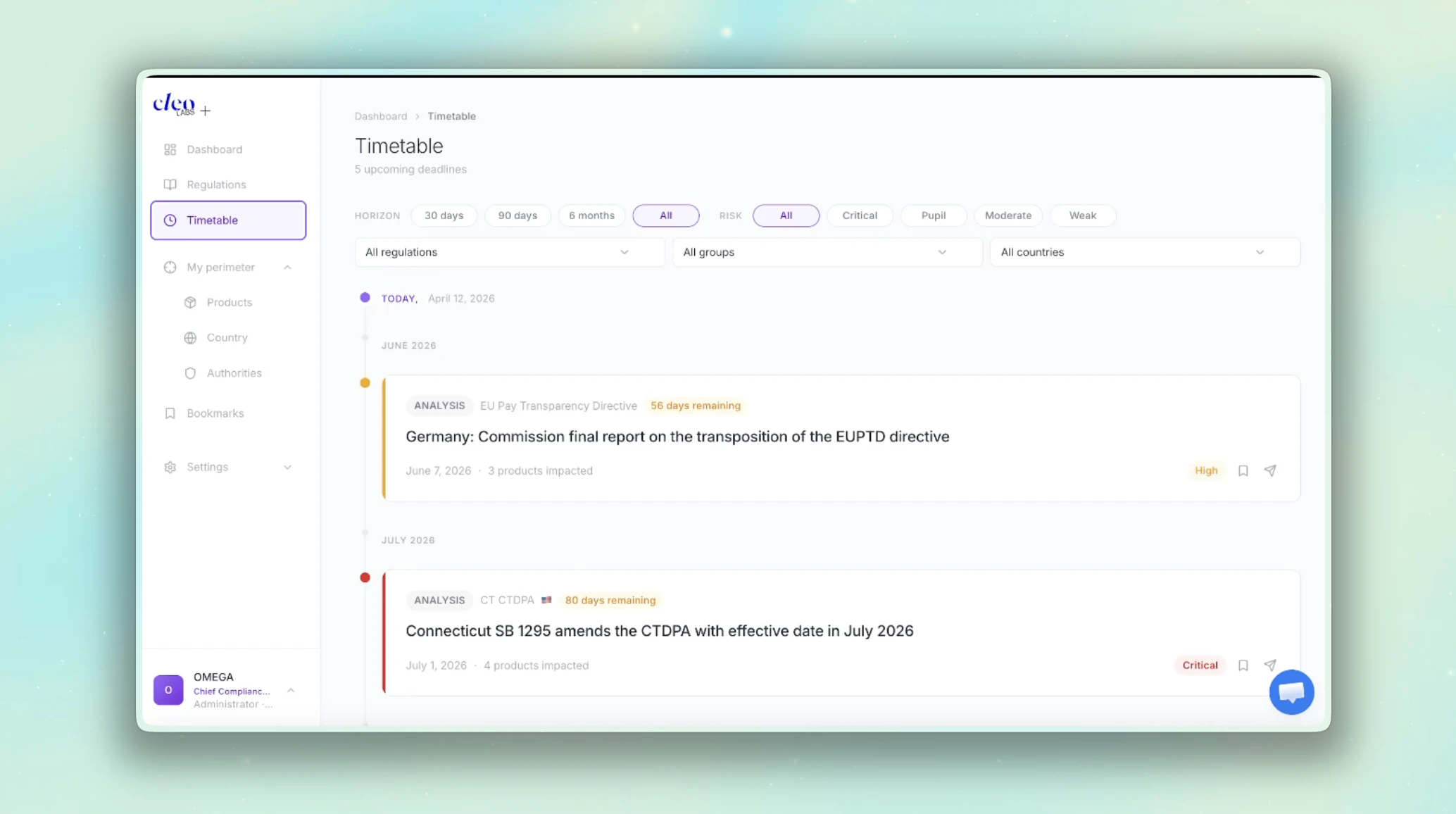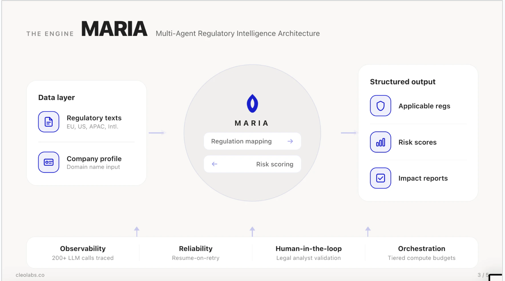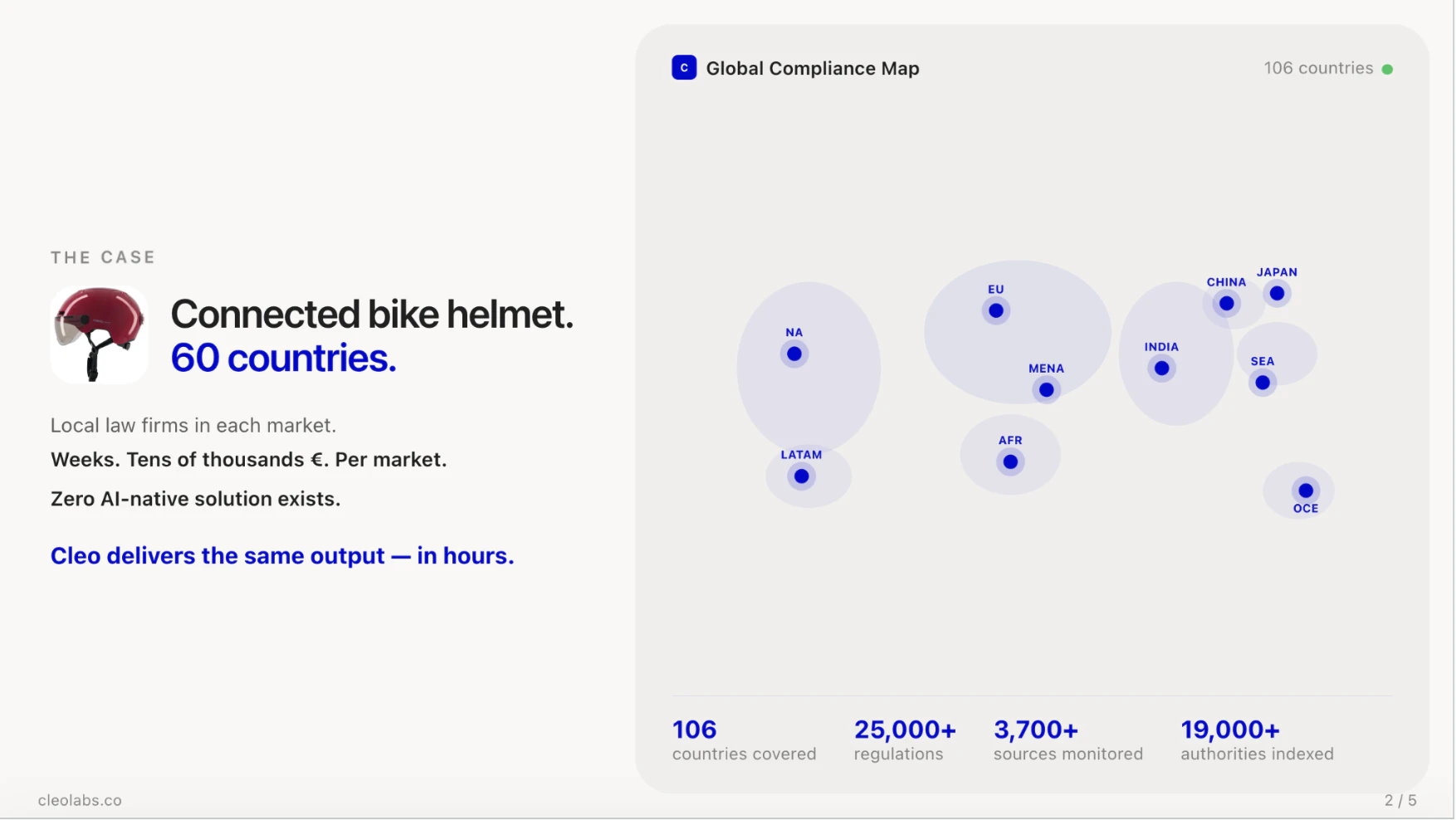 Selling physical products globally? A single item can trigger 100+ regulations across materials, labeling, certifications, and customs and every rule changes from one country to the next. Cleo maps your full regulatory perimeter automatically. Our multi-agent AI pipeline (MARIA) scans 19,000+ authorities in 106 countries and delivers structured compliance maps, verified by legal experts, not hallucinated by a chatbot.)